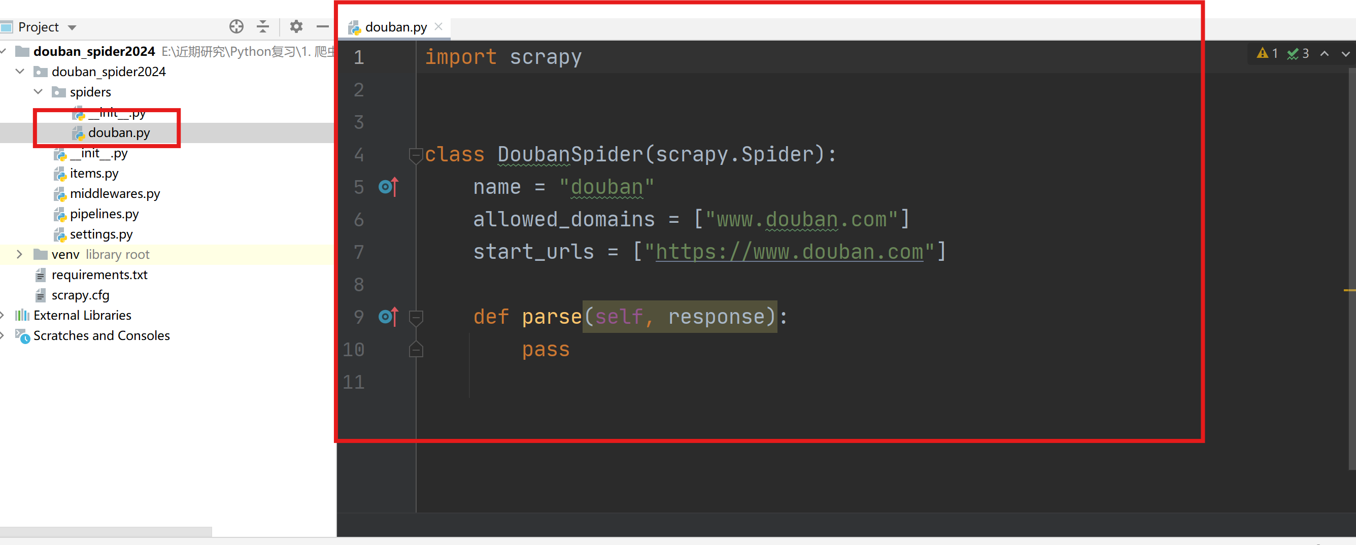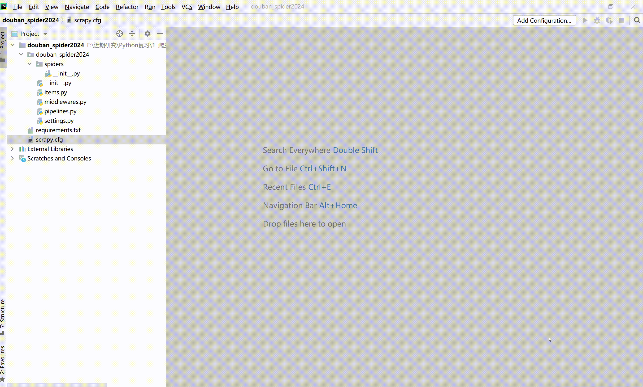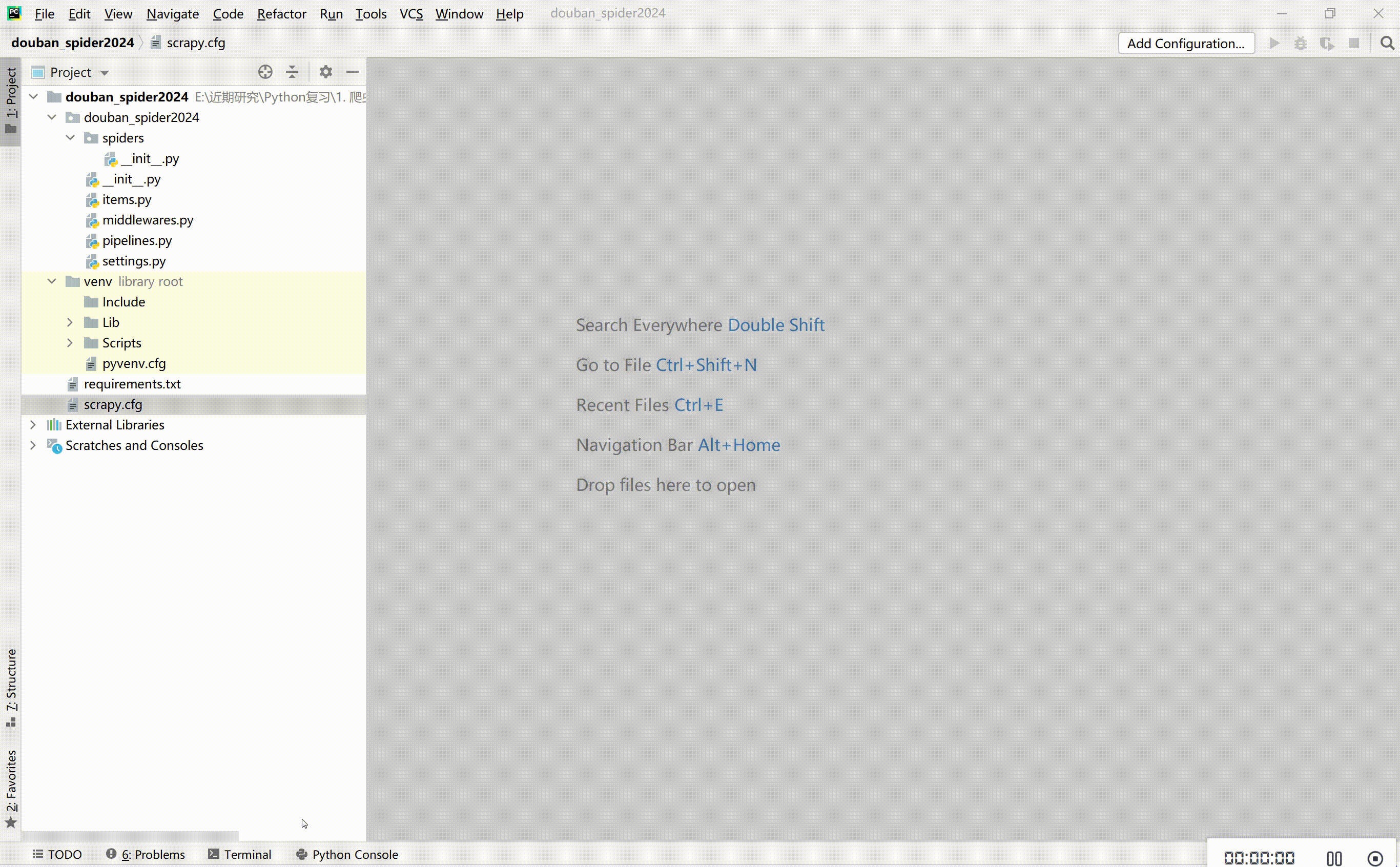 使用Pycharm打开创建好的douban_spider2024文件夹,进入项目。