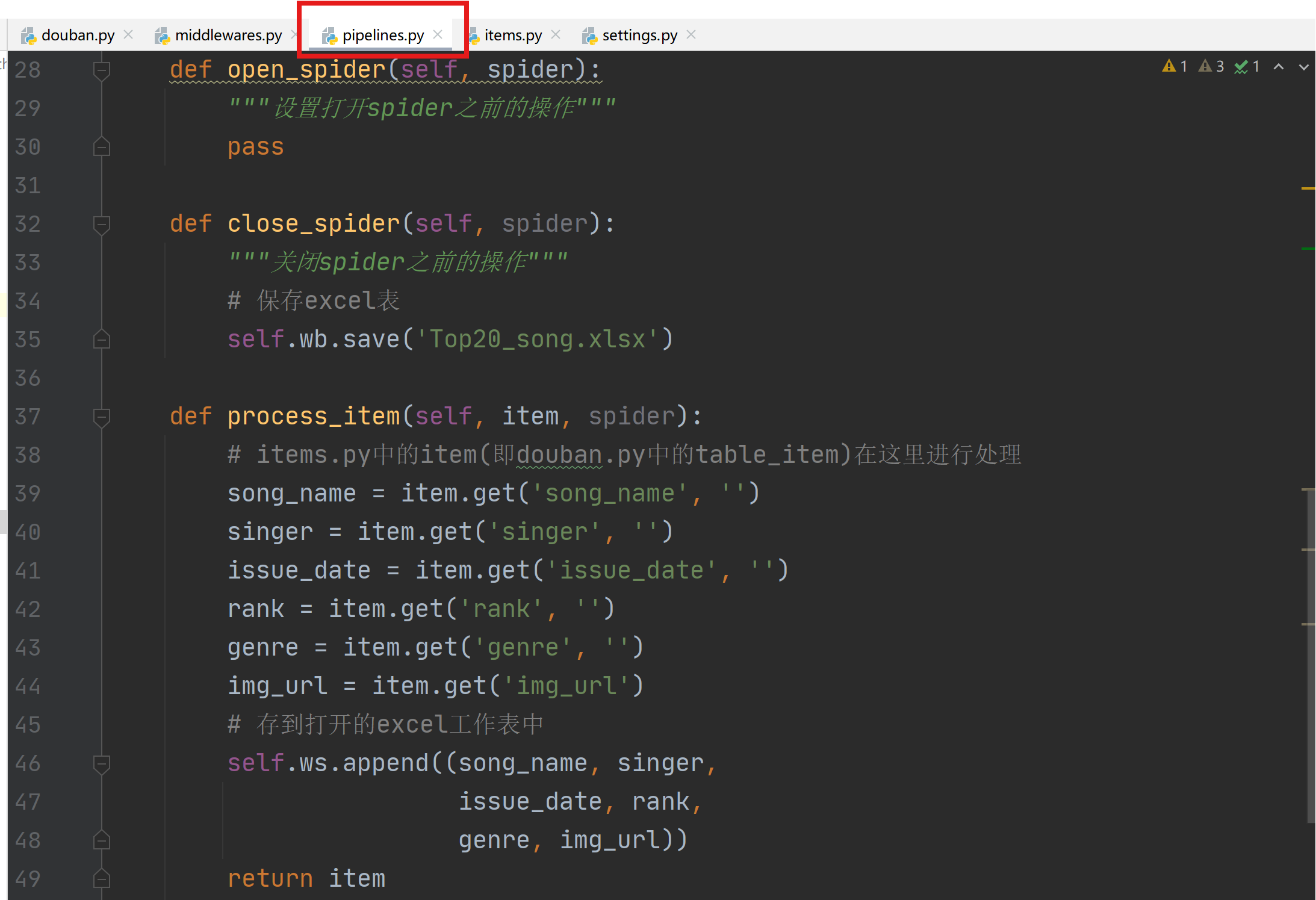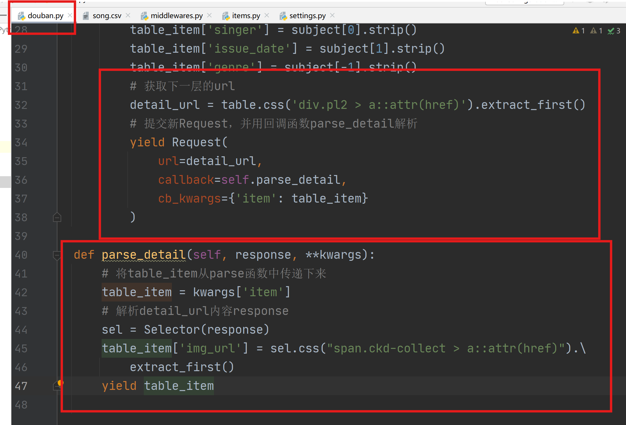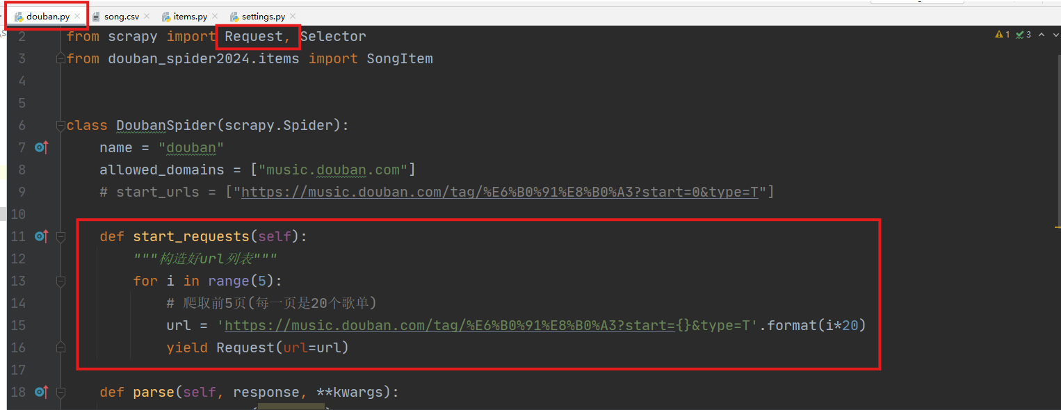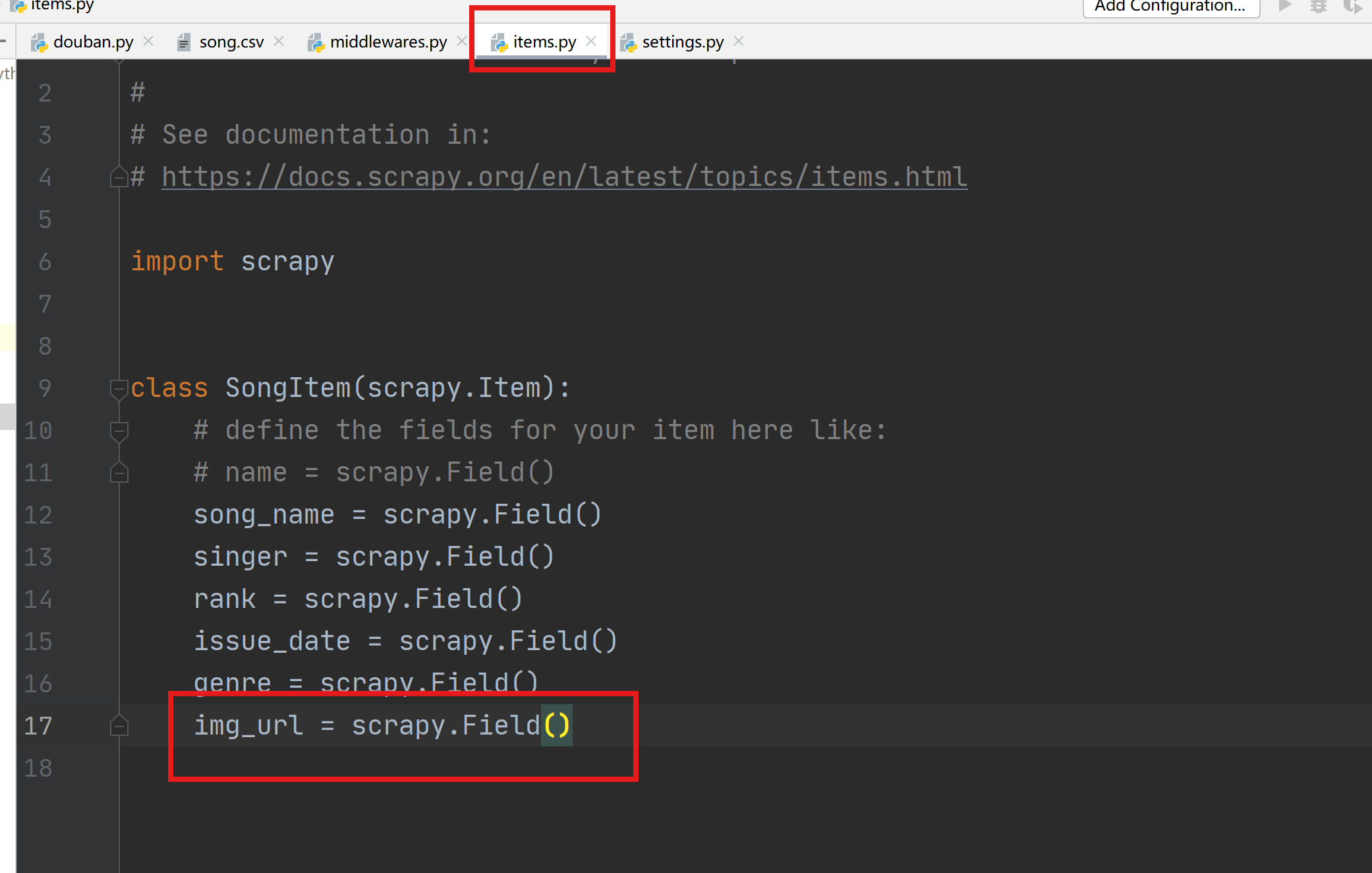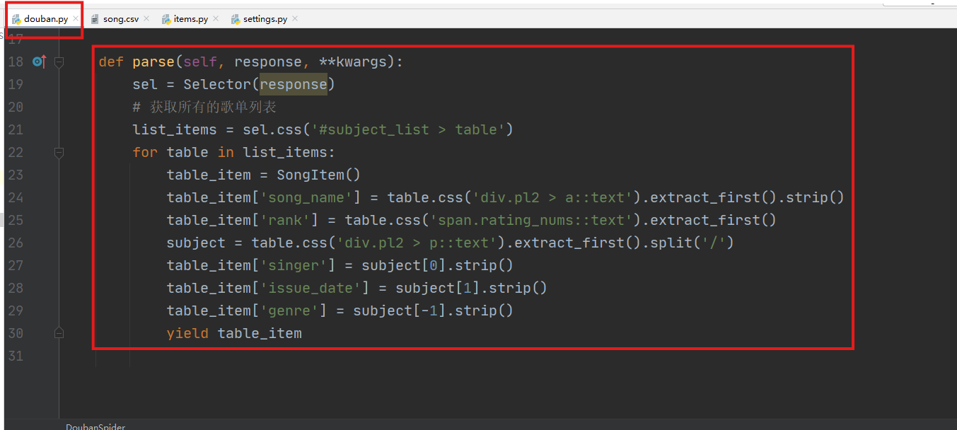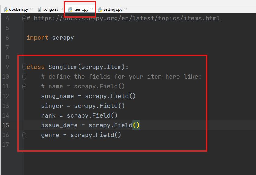 继承scrapy.Item的自定义类SongItem,导入到主程序douban.py中用于存储爬取的字段。