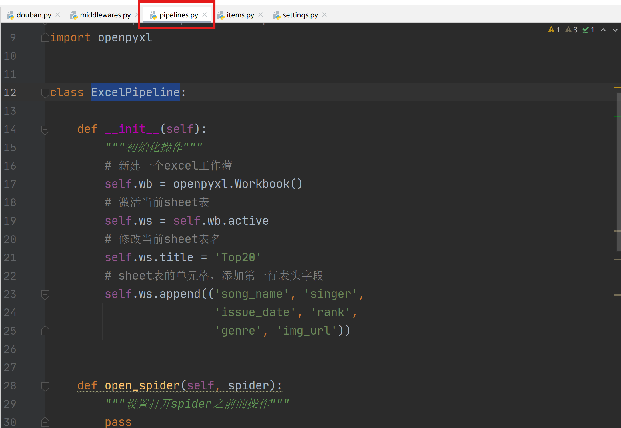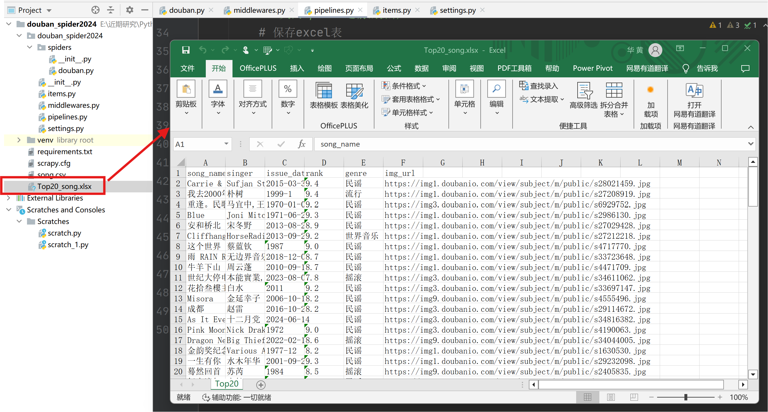 通过pipelines.py构建Excel存储管道,用于将爬取的数据存储到excel中。