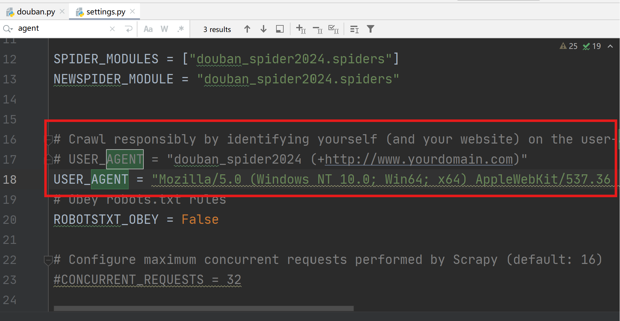 用于控制Scrapy框架中各部件的参数,例如USER_AGENT、COOKIES、代理、中间件启停等。