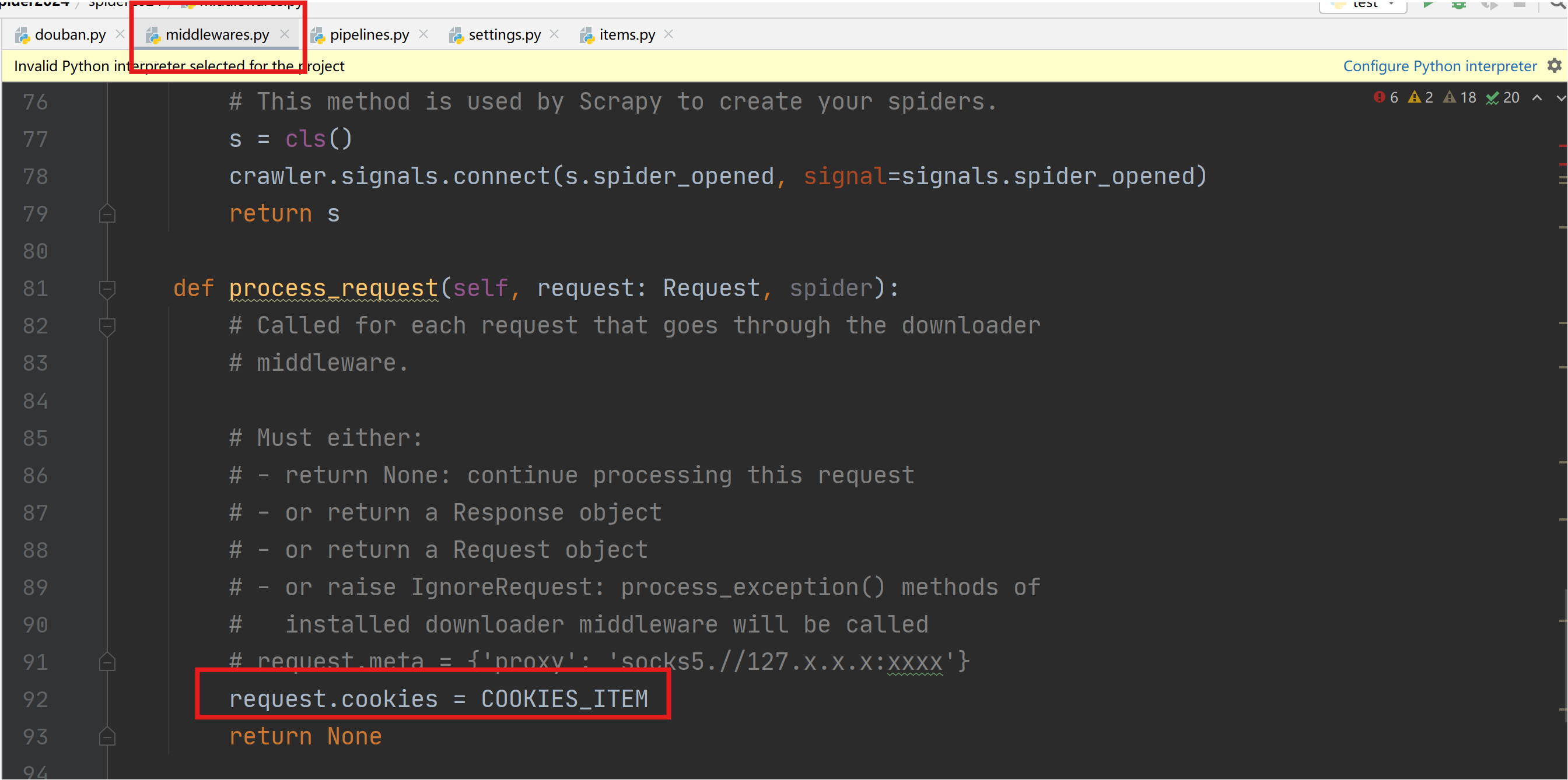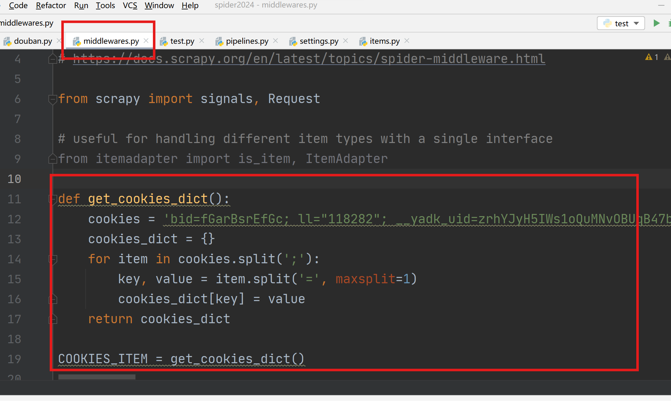 进入middlewares.py程序中设置,新增一个处理cookies的函数,执行cookies函数返回一个包含cookies的字典COOKIE_ITEM。