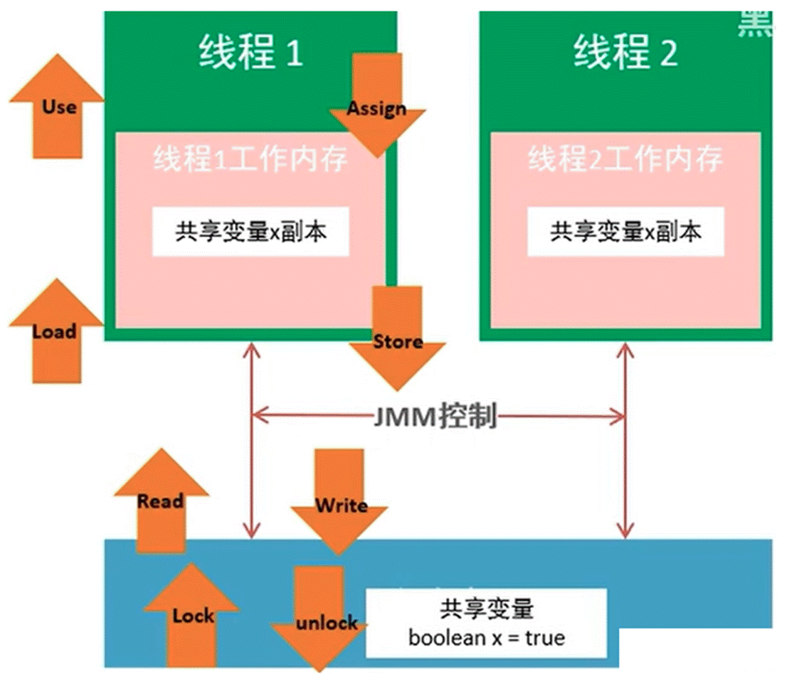 - 接着执行Write操作,即在工作内存中,Assign 赋值给共享变量的值同步到主内存当中,主内存中共享变量取值x由true更改为false。