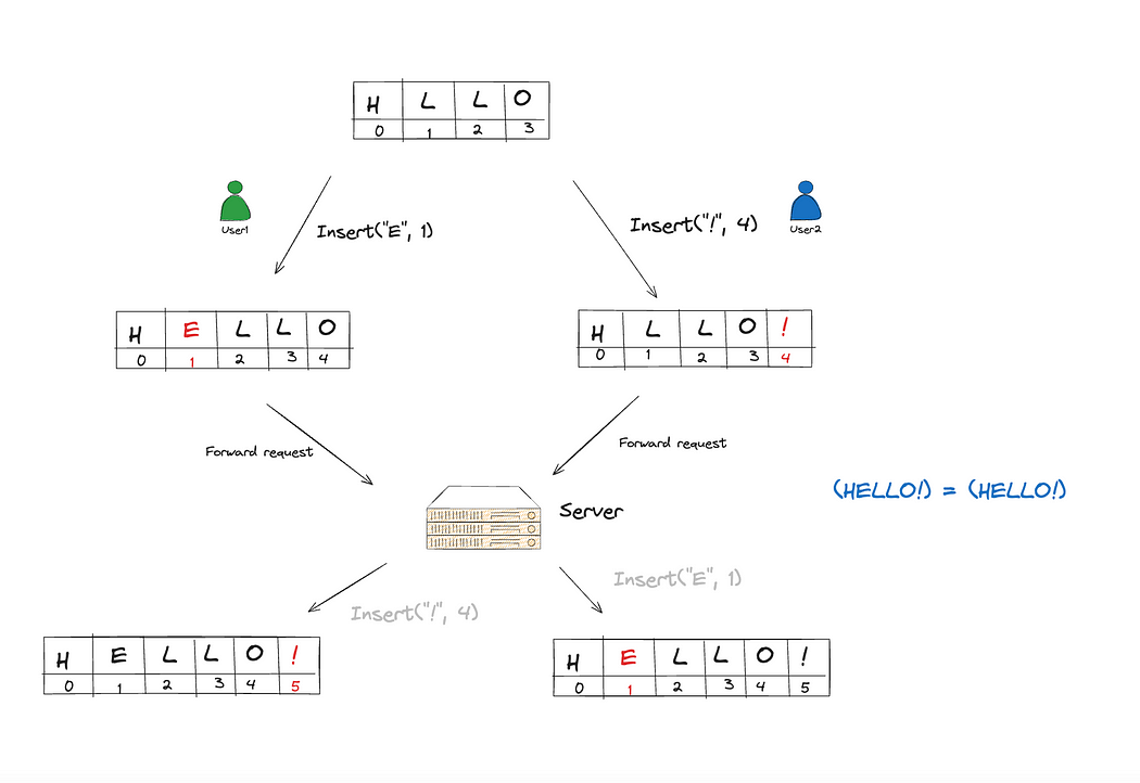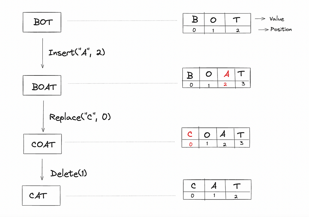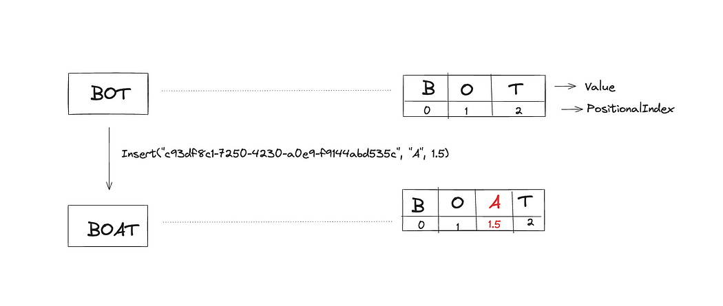 示例描绘来自站点 ID 123e4567-e89b-12d3 的用户在 PositionalIndex 为 1.5 的位置插入一个值为 A 的字符。尽管添加了新字符,但使用小数索引保留了现有字符的位置索引。因此,避免了操作之间的顺序依赖性。如下所示,在 O 和 T 之间插入()并没有影响 T 的位置。