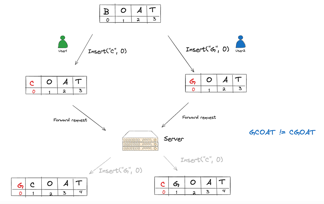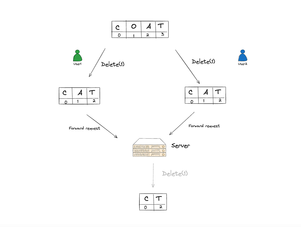 第二个例子表明,不同用户应用相同的操作不会是幂等的。因此,在多个协作者同时编辑文档同一部分时,需冲突解决。