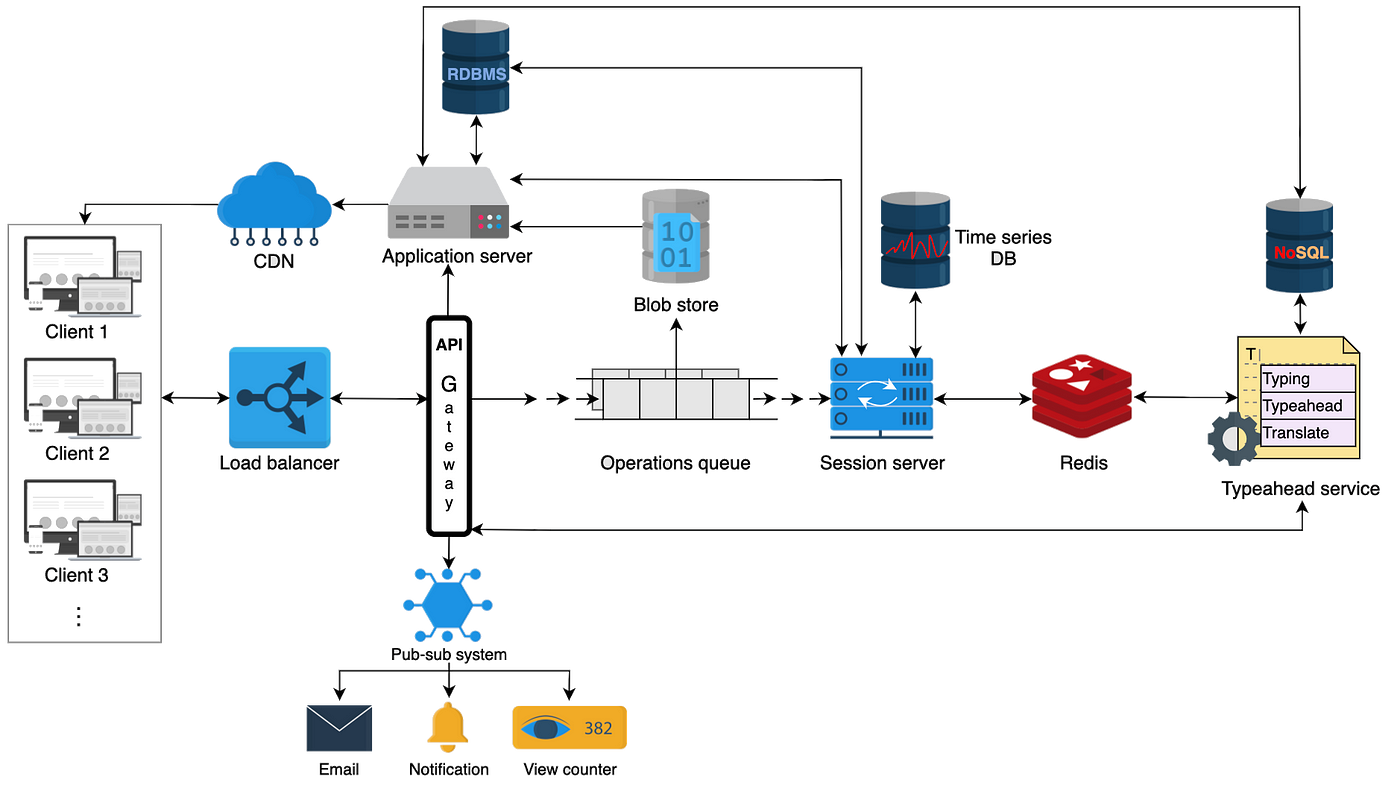 其他组件包括会话服务器,维护用户的会话信息。通过会话服务器管理文档访问权限。本质上,还将有配置、监控、发布-订阅和日志记录服务来处理监控任务,如在服务器失败时监控和选举领导者,排队用户通知等任务,以及记录调试信息。