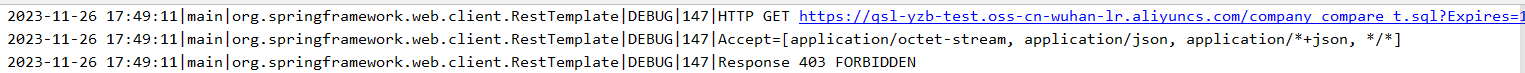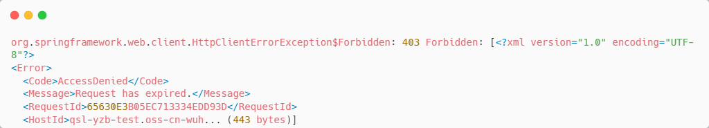 org.springframework.web.client.HttpClientErrorException$Forbidden: 403 Forbidden: [<?xml version="1.0" encoding="UTF-8"?> <Error> <Code>AccessDenied</Code> <Message>Request has expired.</Message> <RequestId>65630E3B05EC713334EDD93D</RequestId> <HostId>qsl-yzb-test.oss-cn-wuh... (443 bytes)] at org.springframework.web.client.HttpClientErrorException.create(HttpClientErrorException.java:109) at org.springframework.web.client.DefaultResponseErrorHandler.handleError(DefaultResponseErrorHandler.java:170) at org.springframework.web.client.DefaultResponseErrorHandler.handleError(DefaultResponseErrorHandler.java:112) at org.springframework.web.client.ResponseErrorHandler.handleError(ResponseErrorHandler.java:63) at org.springframework.web.client.RestTemplate.handleResponse(RestTemplate.java:785) at org.springframework.web.client.RestTemplate.doExecute(RestTemplate.java:743) at org.springframework.web.client.RestTemplate.execute(RestTemplate.java:677) at org.springframework.web.client.RestTemplate.getForEntity(RestTemplate.java:345) at com.qsl.RestTemplateTest.testOss(RestTemplateTest.java:27) at sun.reflect.NativeMethodAccessorImpl.invoke0(Native Method) at sun.reflect.NativeMethodAccessorImpl.invoke(NativeMethodAccessorImpl.java:62) at sun.reflect.DelegatingMethodAccessorImpl.invoke(DelegatingMethodAccessorImpl.java:43) at java.lang.reflect.Method.invoke(Method.java:498) at org.junit.runners.model.FrameworkMethod$1.runReflectiveCall(FrameworkMethod.java:50) at org.junit.internal.runners.model.ReflectiveCallable.run(ReflectiveCallable.java:12) at org.junit.runners.model.FrameworkMethod.invokeExplosively(FrameworkMethod.java:47) at org.junit.internal.runners.statements.InvokeMethod.evaluate(InvokeMethod.java:17) at org.springframework.test.context.junit4.statements.RunBeforeTestExecutionCallbacks.evaluate(RunBeforeTestExecutionCallbacks.java:74) at org.springframework.test.context.junit4.statements.RunAfterTestExecutionCallbacks.evaluate(RunAfterTestExecutionCallbacks.java:84) at org.springframework.test.context.junit4.statements.RunBeforeTestMethodCallbacks.evaluate(RunBeforeTestMethodCallbacks.java:75) at org.springframework.test.context.junit4.statements.RunAfterTestMethodCallbacks.evaluate(RunAfterTestMethodCallbacks.java:86) at org.springframework.test.context.junit4.statements.SpringRepeat.evaluate(SpringRepeat.java:84) at org.junit.runners.ParentRunner.runLeaf(ParentRunner.java:325) at org.springframework.test.context.junit4.SpringJUnit4ClassRunner.runChild(SpringJUnit4ClassRunner.java:251) at org.springframework.test.context.junit4.SpringJUnit4ClassRunner.runChild(SpringJUnit4ClassRunner.java:97) at org.junit.runners.ParentRunner$3.run(ParentRunner.java:290) at org.junit.runners.ParentRunner$1.schedule(ParentRunner.java:71) at org.junit.runners.ParentRunner.runChildren(ParentRunner.java:288) at org.junit.runners.ParentRunner.access$000(ParentRunner.java:58) at org.junit.runners.ParentRunner$2.evaluate(ParentRunner.java:268) at org.springframework.test.context.junit4.statements.RunBeforeTestClassCallbacks.evaluate(RunBeforeTestClassCallbacks.java:61) at org.springframework.test.context.junit4.statements.RunAfterTestClassCallbacks.evaluate(RunAfterTestClassCallbacks.java:70) at org.junit.runners.ParentRunner.run(ParentRunner.java:363) at org.springframework.test.context.junit4.SpringJUnit4ClassRunner.run(SpringJUnit4ClassRunner.java:190) at org.junit.runner.JUnitCore.run(JUnitCore.java:137) at com.intellij.junit4.JUnit4IdeaTestRunner.startRunnerWithArgs(JUnit4IdeaTestRunner.java:68) at com.intellij.rt.junit.IdeaTestRunner$Repeater.startRunnerWithArgs(IdeaTestRunner.java:33) at com.intellij.rt.junit.JUnitStarter.prepareStreamsAndStart(JUnitStarter.java:230) at com.intellij.rt.junit.JUnitStarter.main(JUnitStarter.java:58)