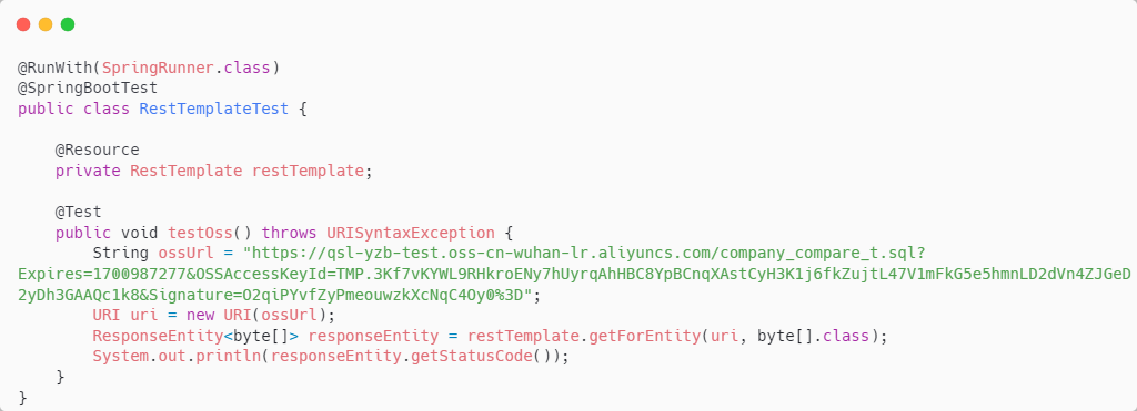 package com.qsl; import org.junit.Test; import org.junit.runner.RunWith; import org.springframework.boot.test.context.SpringBootTest; import org.springframework.http.ResponseEntity; import org.springframework.test.context.junit4.SpringRunner; import org.springframework.web.client.RestTemplate; import javax.annotation.Resource; /** * @description: RestTemplate 测试 * @author: 博客园@青石路 * @date: 2023/11/26 15:31 */ @RunWith(SpringRunner.class) @SpringBootTest public class RestTemplateTest { @Resource private RestTemplate restTemplate; @Test public void testOss() { String ossUrl = "https://qsl-yzb-test.oss-cn-wuhan-lr.aliyuncs.com/company_compare_t.sql?Expires=1700987277&OSSAccessKeyId=TMP.3Kf7vKYWL9RHkroENy7hUyrqAhHBC8YpBCnqXAstCyH3K1j6fkZujtL47V1mFkG5e5hmnLD2dVn4ZJGeD2yDh3GAAQc1k8&Signature=O2qiPYvfZyPmeouwzkXcNqC4Oy0%3D"; ResponseEntity<byte[]> responseEntity = restTemplate.getForEntity(ossUrl, byte[].class); System.out.println(responseEntity.getStatusCode()); } }
