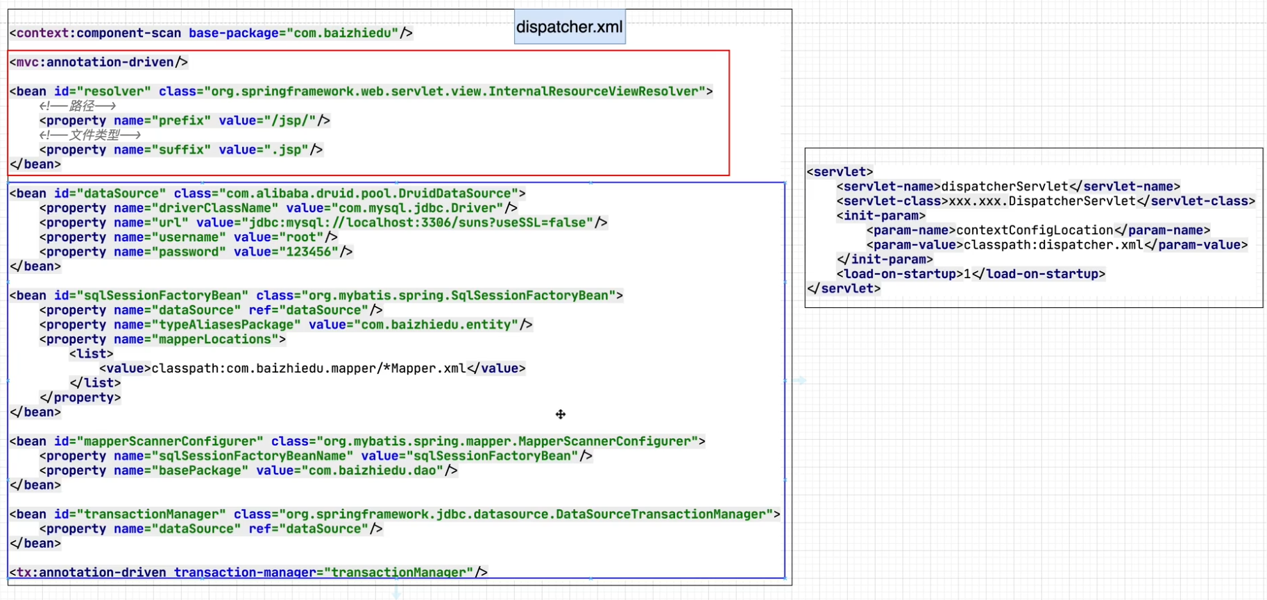 # dispatcher.xml # SpringMVC相关的配置 <!--设置注解扫描的路径--> <context:component-scan base-package="com.baizhi"/> <!--引入SpringMVC的核心功能--> <mvc:annotation-driven/> <!--整合跳转路径,解耦合--> <bean id="viewResolver" class="org.springframework.web.servlet.view.InternalResourceViewResolver"> <property name="prefix" value="/"/> <property name="suffix" value=".jsp"/> </bean> # web.xml子容器的配置 <servlet> <servlet-name>dispatcherServlet</servlet-name> <servlet-class>org.springframework.web.servlet.DispatcherServlet</servlet-class> <init-param> <param-name>contextConfigLocation</param-name> <param-value>classpath:dispatcher.xml</param-value> </init-param> <load-on-startup>1</load-on-startup> </servlet> <servlet-mapping> <servlet-name>dispatcherServlet</servlet-name> <url-pattern>/</url-pattern> </servlet-mapping> -