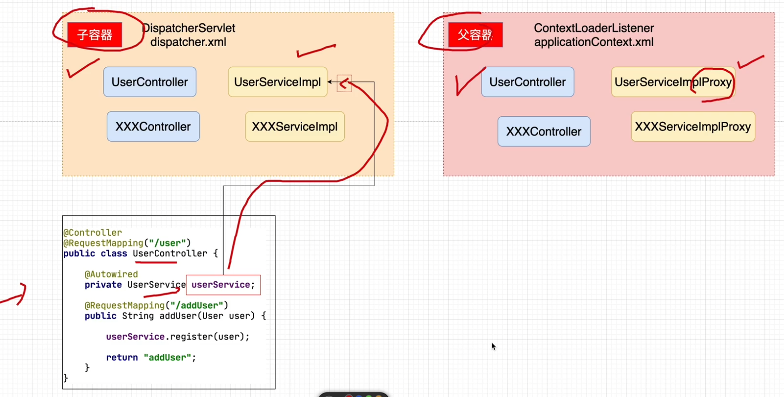子容器:只扫描控制器及与MVC相关的内容 <context:component-scan base-package="com.baizhi.controller"/> 父容器:不扫描控制器与MVC相关的内容 <context:component-scan base-package="com.baizhi"> <context:exclude-filter type="aspectj" expression="com.baizhi.controller"/> </context:component-scan> 注意:在SpingBoot中不会出现父子容器的问题。