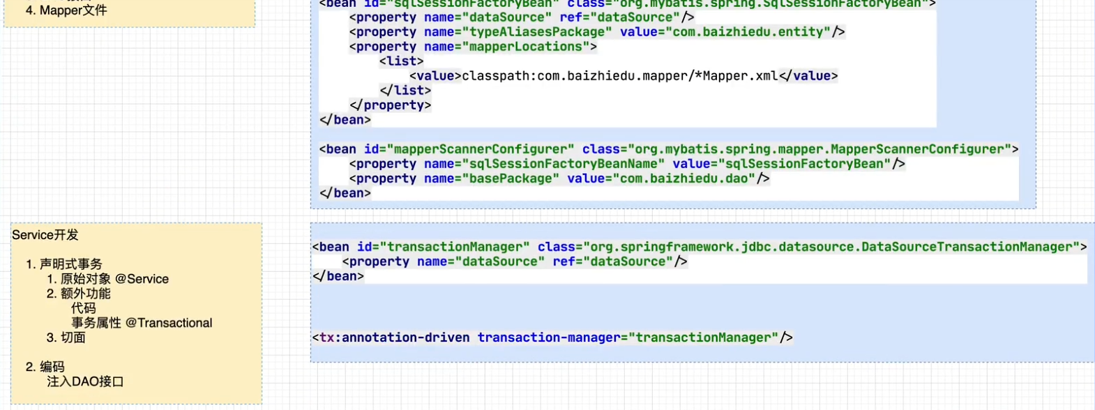 <context:component-scan base-package="com.baizhi"> <context:exclude-filter type="aspectj" expression="com.baizhi.controller"/> </context:component-scan> <!--连接池--> <bean id="dataSource" class="com.alibaba.druid.pool.DruidDataSource"> <property name="driverClassName" value="com.mysql.jdbc.Driver"/> <property name="url" value="jdbc:mysql://localhost:3306/myschool?useSSL=false&allowPublicKeyRetrieval=true"/> <property name="username" value="root"/> <property name="password" value="123456"/> </bean> <!-- 创建SqlSessionFactory SqlSessionFactoryBean--> <bean id="sqlSessionFactoryBean" class="org.mybatis.spring.SqlSessionFactoryBean"> <property name="dataSource" ref="dataSource"/> <property name="typeAliasesPackage" value="com.baizhi.entity"/> <property name="mapperLocations"> <list> <value>classpath:com.baizhi.mapper/*Mapper.xml</value> </list> </property> </bean> <!--创建DAO对象 MapperScannerConfigure--> <bean id="scanner" class="org.mybatis.spring.mapper.MapperScannerConfigurer"> <property name="sqlSessionFactoryBeanName" value="sqlSessionFactoryBean"/> <property name="basePackage" value="com.baizhi.dao"/> </bean> <!-- 配置事务--> <bean id="dataSourceTransactionManager" class="org.springframework.jdbc.datasource.DataSourceTransactionManager"> <property name="dataSource" ref="dataSource"/> </bean> <tx:annotation-driven transaction-manager="dataSourceTransactionManager"/> -