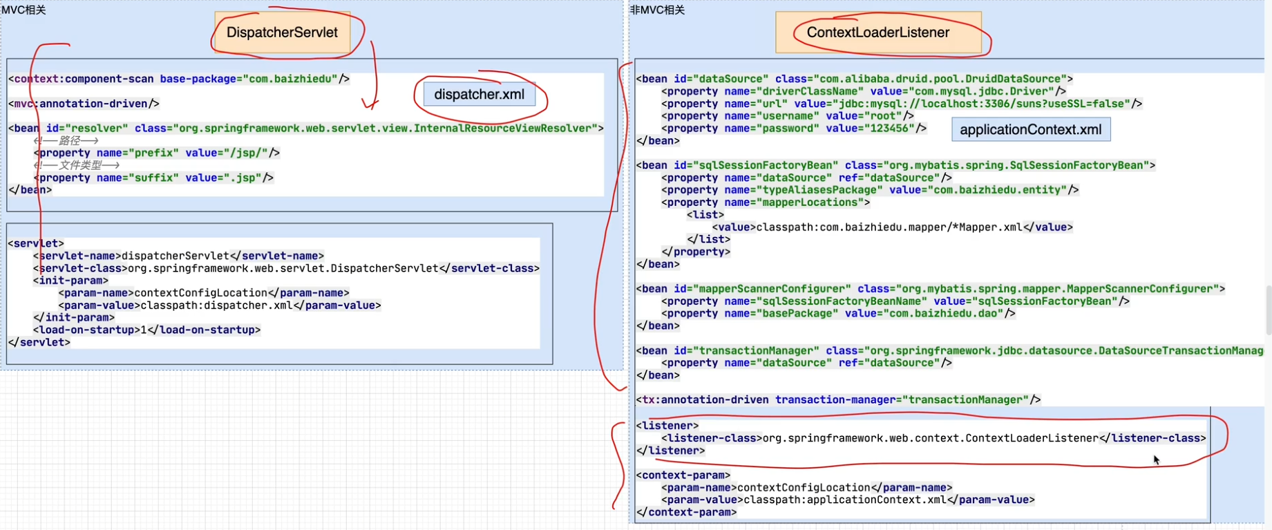 MVC层的对象(Controller,mvc:annotation-driven/,视图解析器)与非MVC层的(连接池 DAO Service 事务),都配置在dispatcher.xml中,最终交给DispatcherServlet创建的工厂来进行实例化,存在着耦合问题,后续一旦替换MVC的实现,代码会受到影响,不利于项目的维护