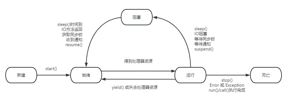 - 死亡(Dead):线程完成了它的全部工作或线程被提前强制性的终止或出现异常导致结束