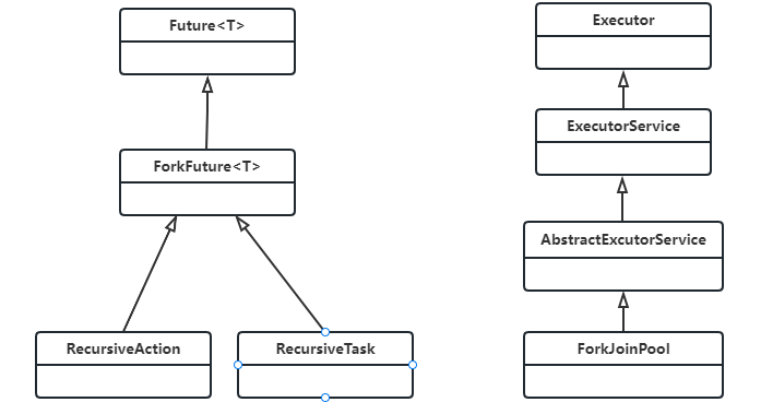 ForkJoinTask 代表一个可以并行、合并的任务,是一个抽象类,它还有两个抽象子类:ResursiveAction和RecursiveTask。其中 ResursiveAction 表示有返回值的任务,RecursiveTask表示无返回值的任务