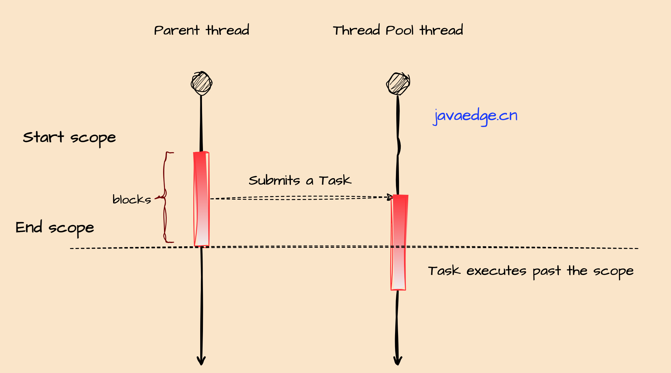 结构化并发基本思想是从一个块(方法或块)内启动的所有任务应在该块结束前终止。即: