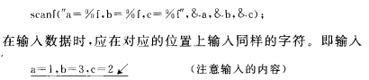 如果在“格式控制字符串”中除了控制声明以外还有其他字符,则在输入数据时在对应的位置上应输入与这些字符相同的字符