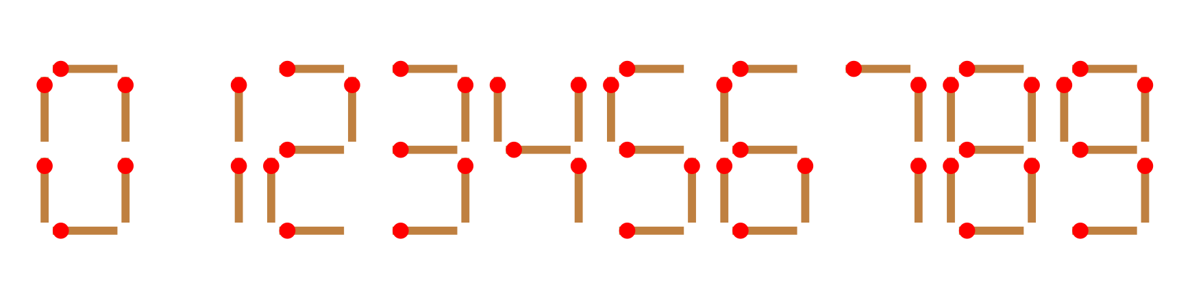 给你 \(n\) 根火柴棍,你可以拼出多少个形如 \(A+B=C\) 的等式?等式中的 \(A\)、\(B\)、\(C\) 是用火柴棍拼出的整数(若该数非零,则最高位不能是 \(0\))。用火柴棍拼数字 \(0\sim9\) 的拼法如图所示: