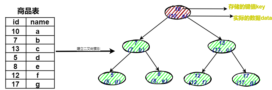 图中可以看到二叉树的节点,节点中存储了键(key)和数据(data);键对应商品表中的 id,数据对应商品表中的行数据。