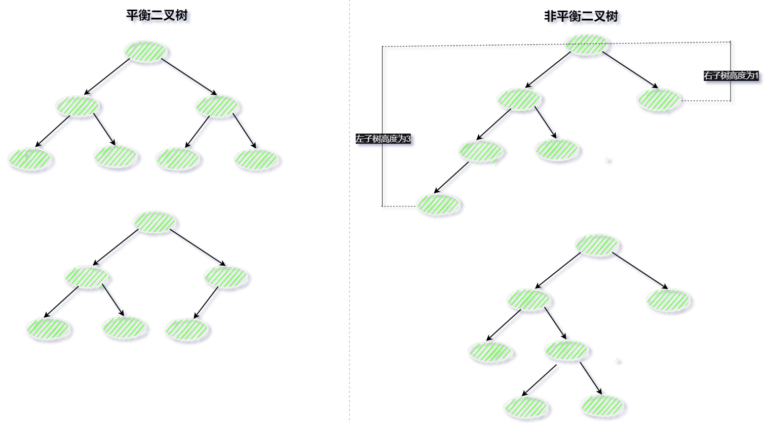 平衡二叉树(AVL 树),在满足二叉查找树特性的基础上,要求每个节点的左右子树的高度差不能超过 1。如下为平衡二叉树与非平衡二叉树的比较图: