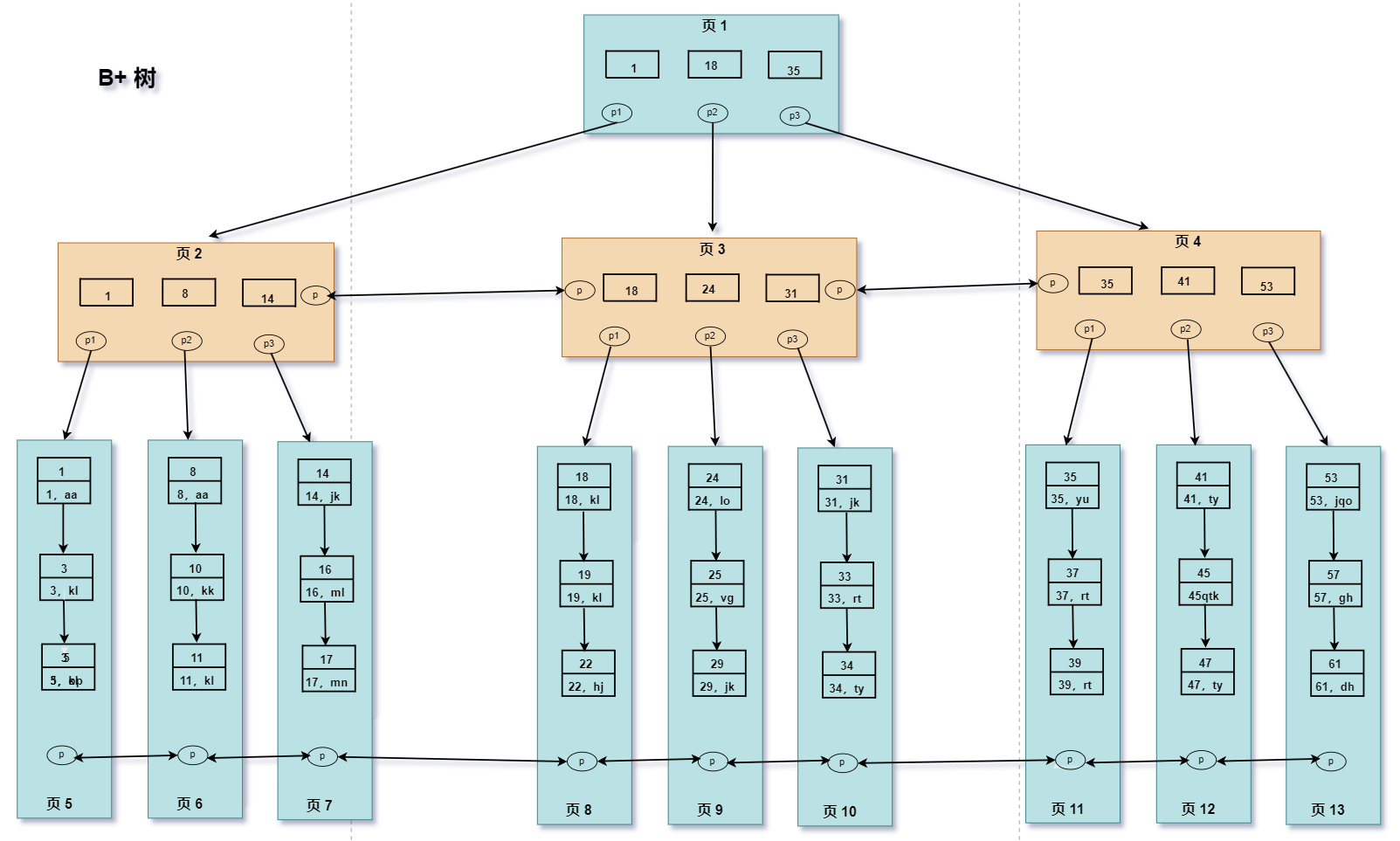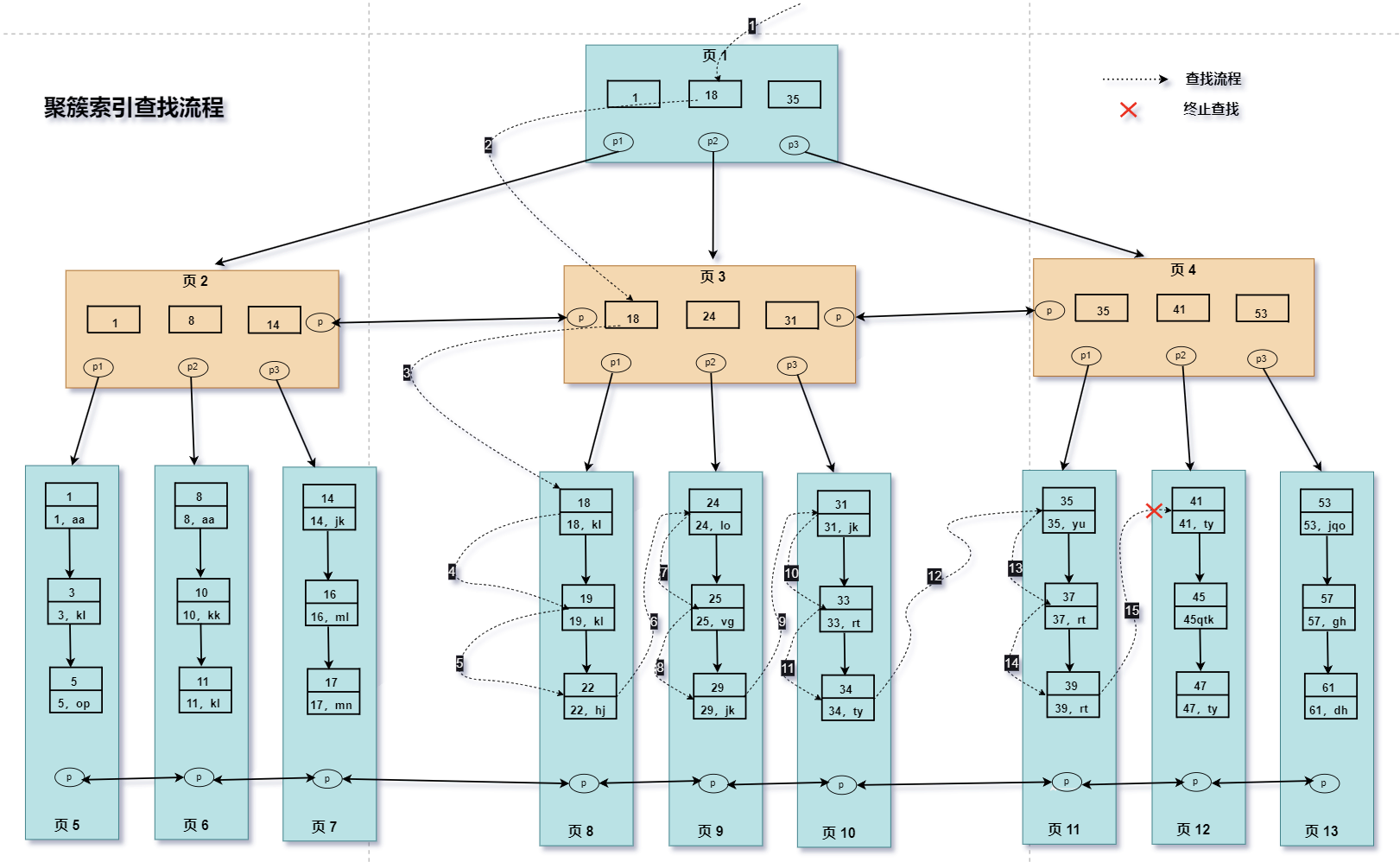 因是范围查找,而且此时所有的数据又都存在叶子节点,并且是有序排列的,因此,可以对页 8 中的键值依次遍历查找并匹配满足条件的数据;
