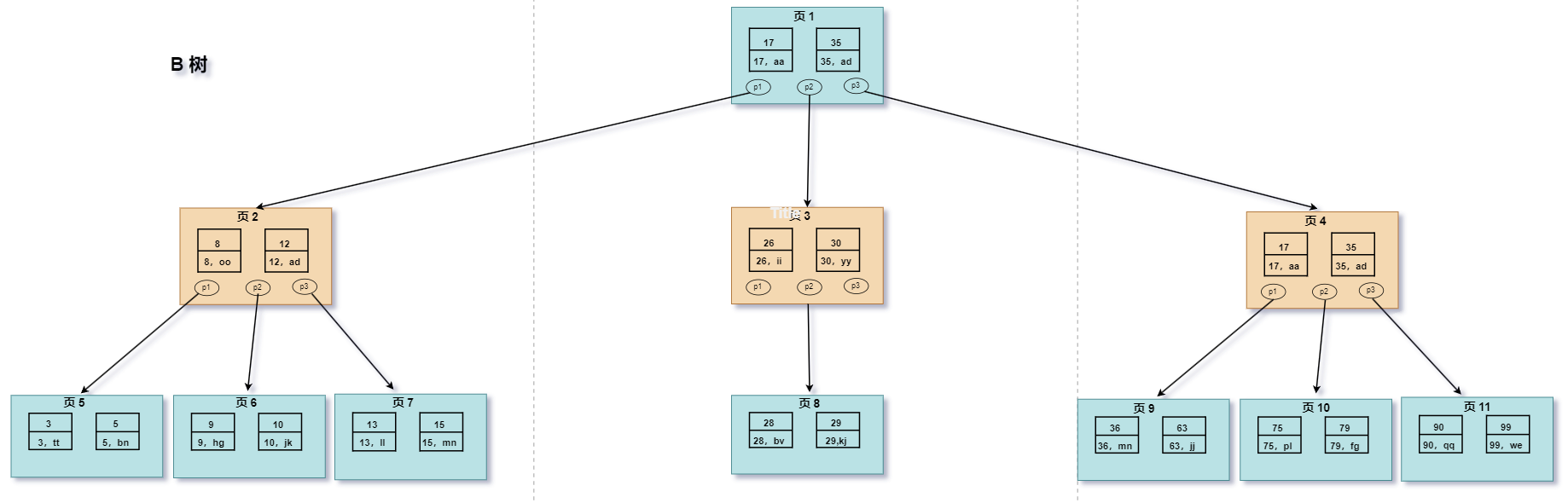 - 先找到根节点也就是页 1,判断 28 在键值 17 和 35 之间,那么我们根据页 1 中的指针 p2 找到页 3