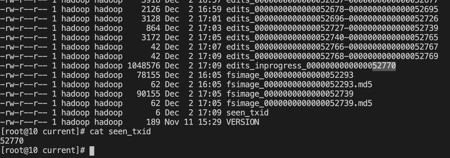 - seen_txid:记录了最后一次 checkpoint 或者 edit 回滚(将 edits_inprogress_xxx 文件回滚成一个新的 Edits 文件)之后的 transaction ID。主要用来检查 NameNode 启动过程中 Edits 文件是否有丢失的情况