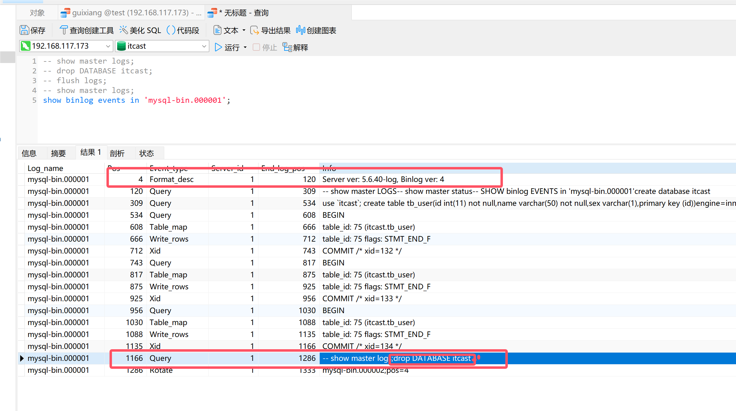 由于我们执行 flush logs 命令新生了一个文件,所以我们执行的删除的命令应该在 binlog.000001 文件里面