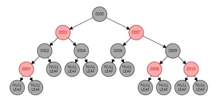如果一个节点没有子节点或者父节点,则该节点的相应指针属性值为Null,这些Null视为叶节点,叶节点是黑色。