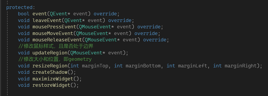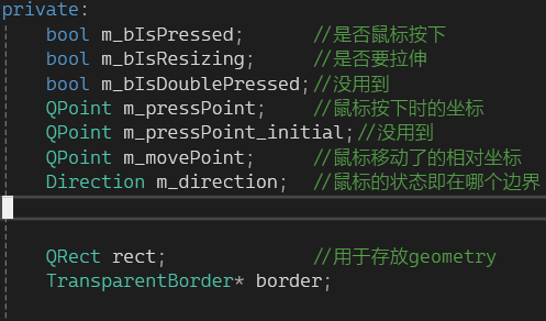 相比较,我将m_movePoint变成是m_pressPoint距离鼠标的相对坐标;然后让m_bIsResizing的值由m_direction来判断是否要拉伸窗口,同时添加了一个透明的带边框的窗体border(TransparentBorder不是qt库的)来实现预览移动而拉伸的状态,因为我将qt小罗的及时修改边框的位置和大小改成延时,所以需要有个能预览的边框来观看。
