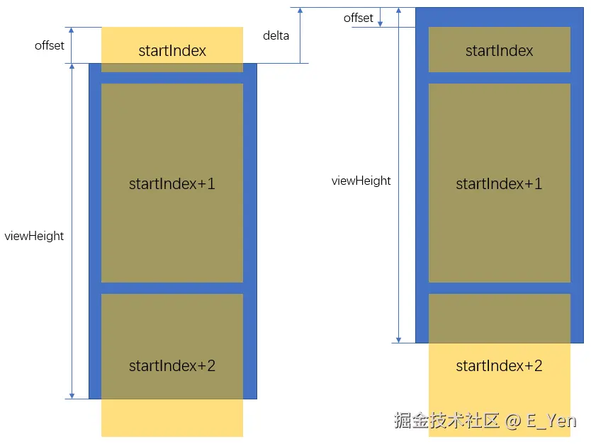 向下滚动:offset 循环减去 height[startIndex],直到 offset - height[startIndex] < paddingHeight 向上滚动:offset 循环加上 height[startIndex-1],直到 offset >= paddingHeight