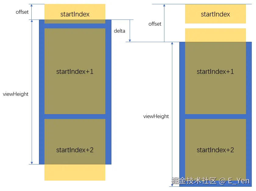 那么丢掉了这张表之后,该如何确定渲染的范围呢?仔细思考,实际上虚拟列表只需要起始元素索引值 startIndex和起始元素到可视区起始位置的距离 offset。结束的位置只需要从起始元素开始,不断累加元素的高度,直到没有更多的元素或者列表高度已经超过渲染范围即可。然后你就会发现在这种设计下: