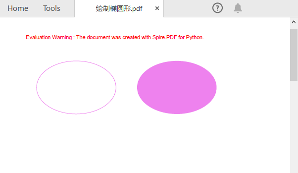 from spire.pdf.common import * from spire.pdf import * # 创建PDF文档 pdf = PdfDocument() # 添加页面 page = pdf.Pages.Add() # 保存当前绘图状态 state = page.Canvas.Save() # 创建画笔 pen = PdfPens.get_Violet() # 用画笔在页面上绘制椭圆形 page.Canvas.DrawEllipse(pen, 30.0, 60.0, 150.0, 100.0) # 创建填充画刷对象 brush = PdfSolidBrush(PdfRGBColor(Color.get_Violet())) # 绘制填充的椭圆形状 page.Canvas.DrawEllipse(brush, 220.0, 60.0, 150.0, 100.0) # 恢复之前保存的绘图状态 page.Canvas.Restore(state) # 保存PDF文档 pdf.SaveToFile("绘制椭圆形.pdf") pdf.Close() pdf.Dispose()