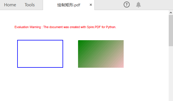from spire.pdf.common import * from spire.pdf import * # 创建PDF文档 pdf = PdfDocument() # 添加页面 page = pdf.Pages.Add() # 保存当前绘图状态 state = page.Canvas.Save() # 创建指定颜色和粗细的画笔 pen = PdfPen(PdfRGBColor(Color.get_Blue()), 1.5) # 用画笔在页面上绘制一个矩形 page.Canvas.DrawRectangle(pen, RectangleF(PointF(20.0, 60.0), SizeF(150.0, 90.0))) # 创建一个线性渐变笔刷 linearGradientBrush = PdfLinearGradientBrush(PointF(220.0, 60.0), PointF(350.0, 180.0), PdfRGBColor(Color.get_Green()), PdfRGBColor(Color.get_Pink())) # 用线性渐变笔刷绘制一个填充式矩形 page.Canvas.DrawRectangle (linearGradientBrush, RectangleF(PointF(220.0, 60.0), SizeF(150.0, 90.0))) # 恢复之前保存的绘图状态 page.Canvas.Restore(state) # 保存PDF文档 pdf.SaveToFile("绘制矩形.pdf") pdf.Close() pdf.Dispose()