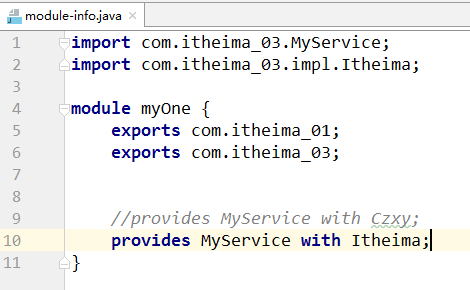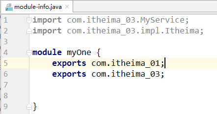 - 在myOne模块中修改module-info.java文件,添加以下内容