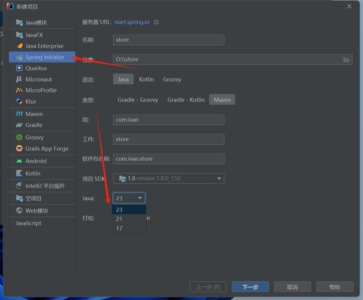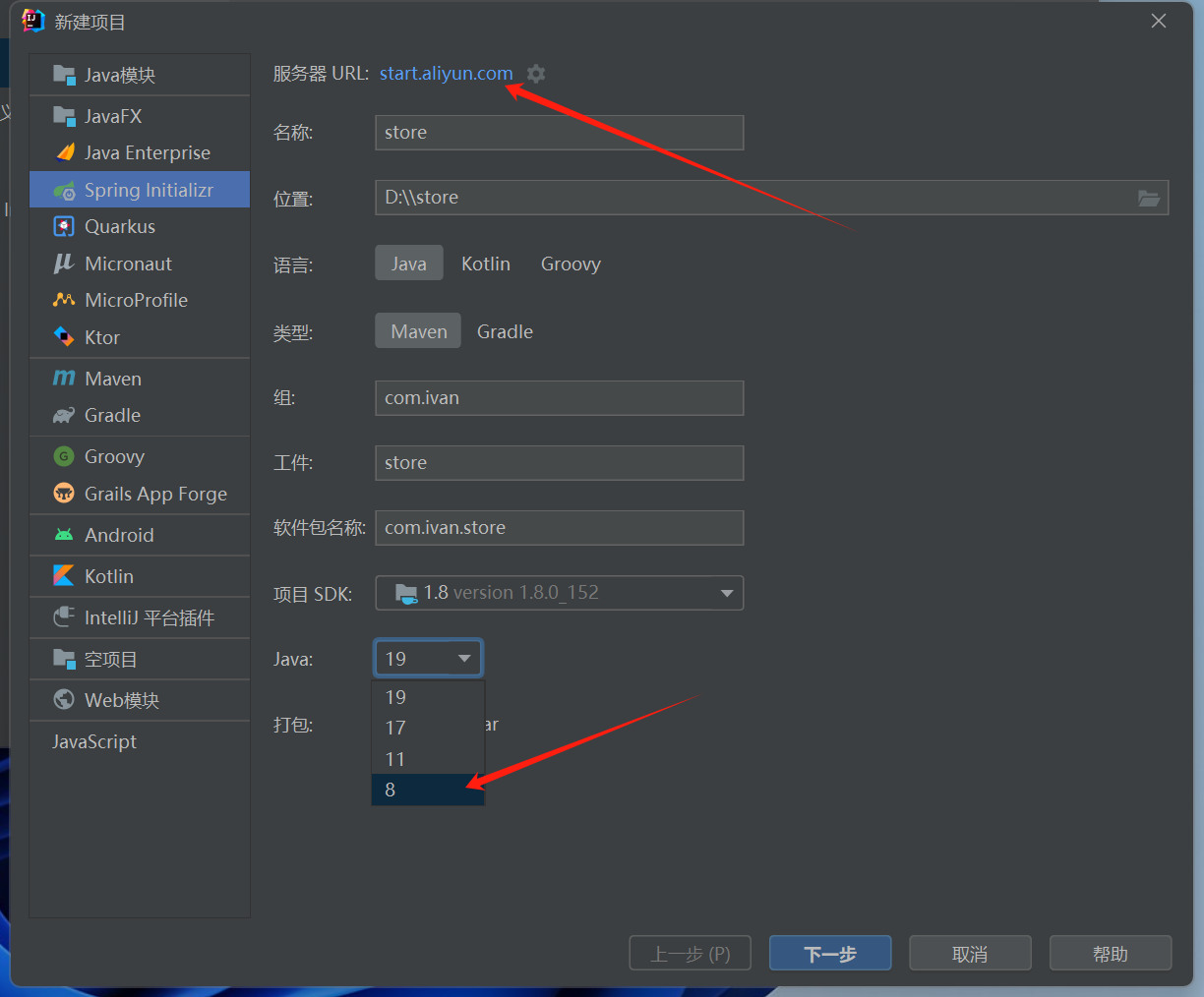 下图是一般我们在创建项目时都会选择通用一点的JDK8版本,我用的spring boot版本是2.4左右。如果版本都太新的话,可能会发生很多莫名其妙的不兼容问题。但是默认的服务器好像已经没有8了,我们按照以下步骤来修改。