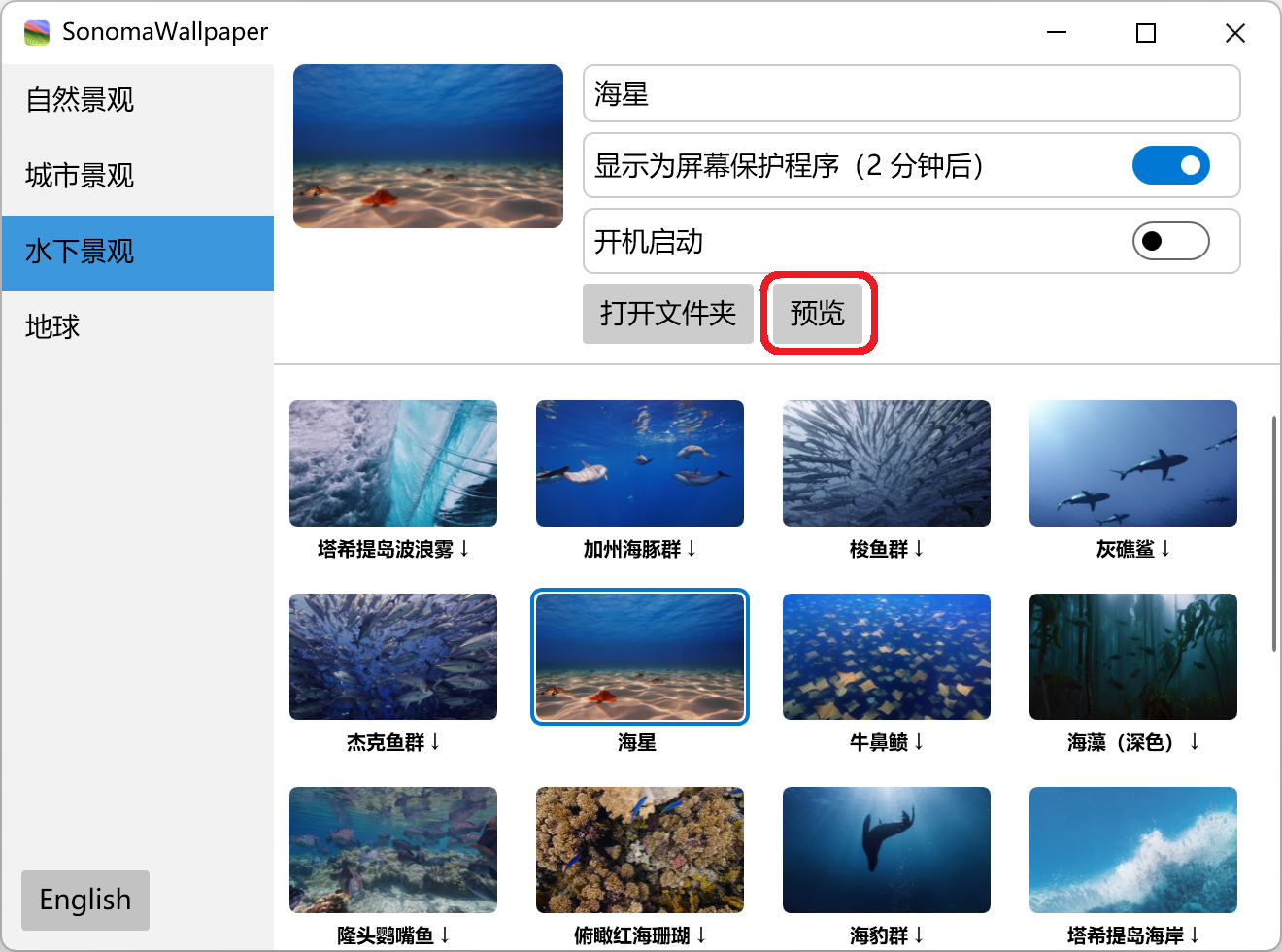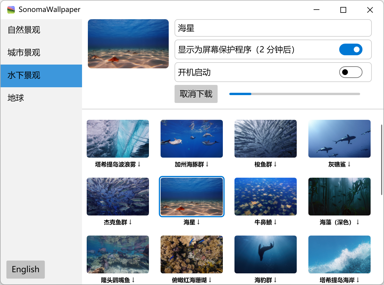 Sonoma Wallpaper 是首款将 macOS Sonoma 4k 120 帧动态屏保壁纸带到 Windows 11 的软件,壁纸包含了自然景观、城市景观、水下景观和地球四个主题的屏保共有 134 个 4k 屏保壁纸。