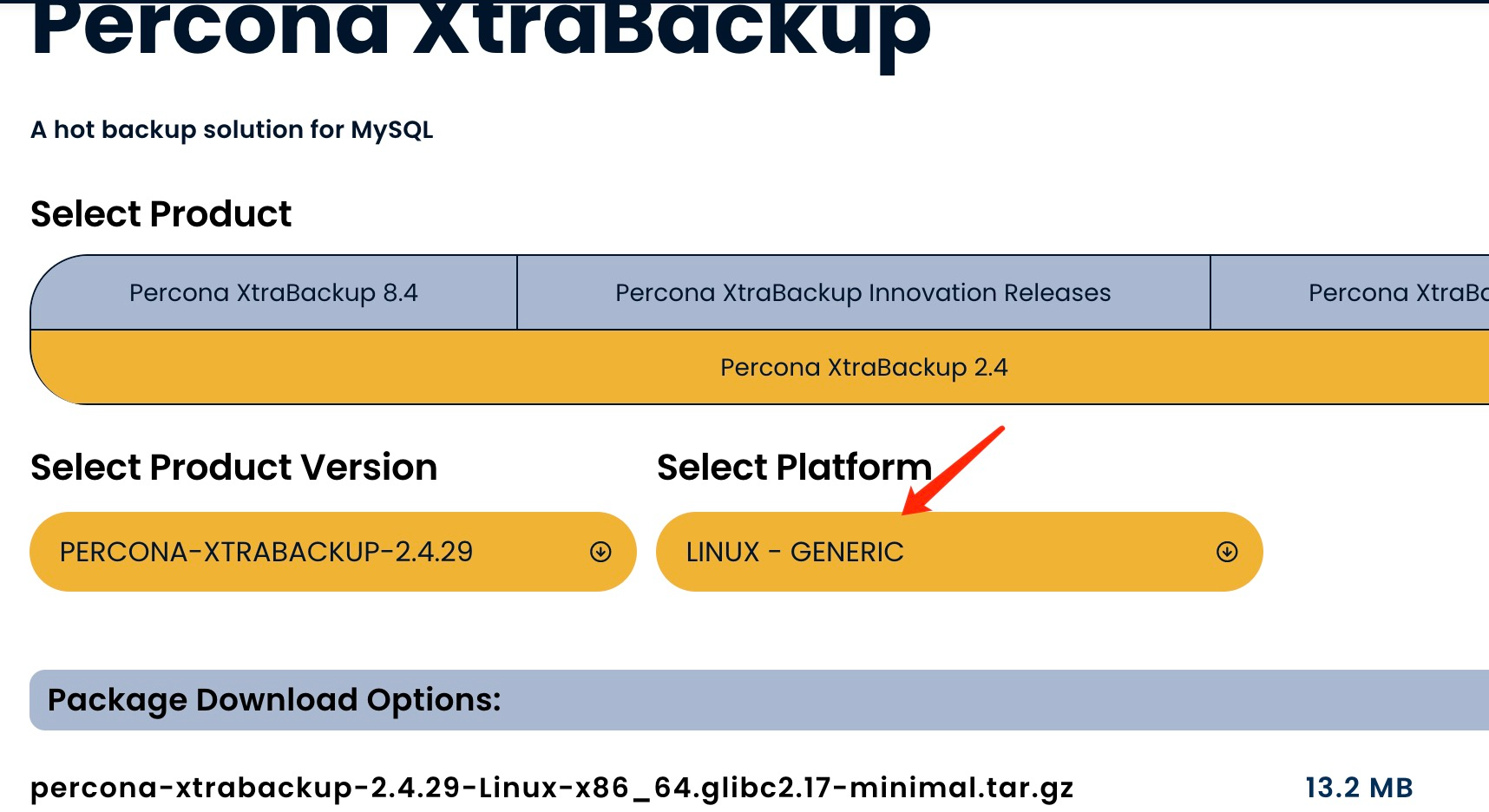 https://www.percona.com/downloads下载二进制安装包percona-xtrabackup-2.4.29-Linux-x86_64.glibc2.17.tar.gz,龙蜥操作系统选择generic