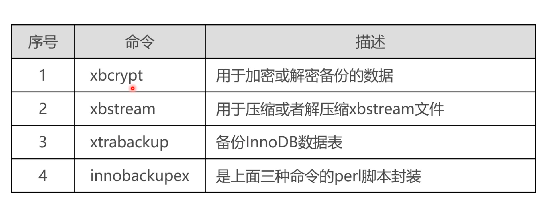 创建目录 /home/xtrabackup 二进制安装包上传此目录 2.1 解压缩 tar -zxvf percona-xtrabackup-2.4.29-Linux-x86_64.glibc2.17.tar.gz 2.2 移动目录 mv percona-xtrabackup-2.4.29-Linux-x86_64.glibc2.17 /usr/local/xtrabackup-2.4.29 2.3 配置软链接 ln -sf /usr/local/xtrabackup-2.4.29/bin/* /usr/bin/ 2.4 查看版本号 xtrabackup -v 3、xtrabackup命令说明