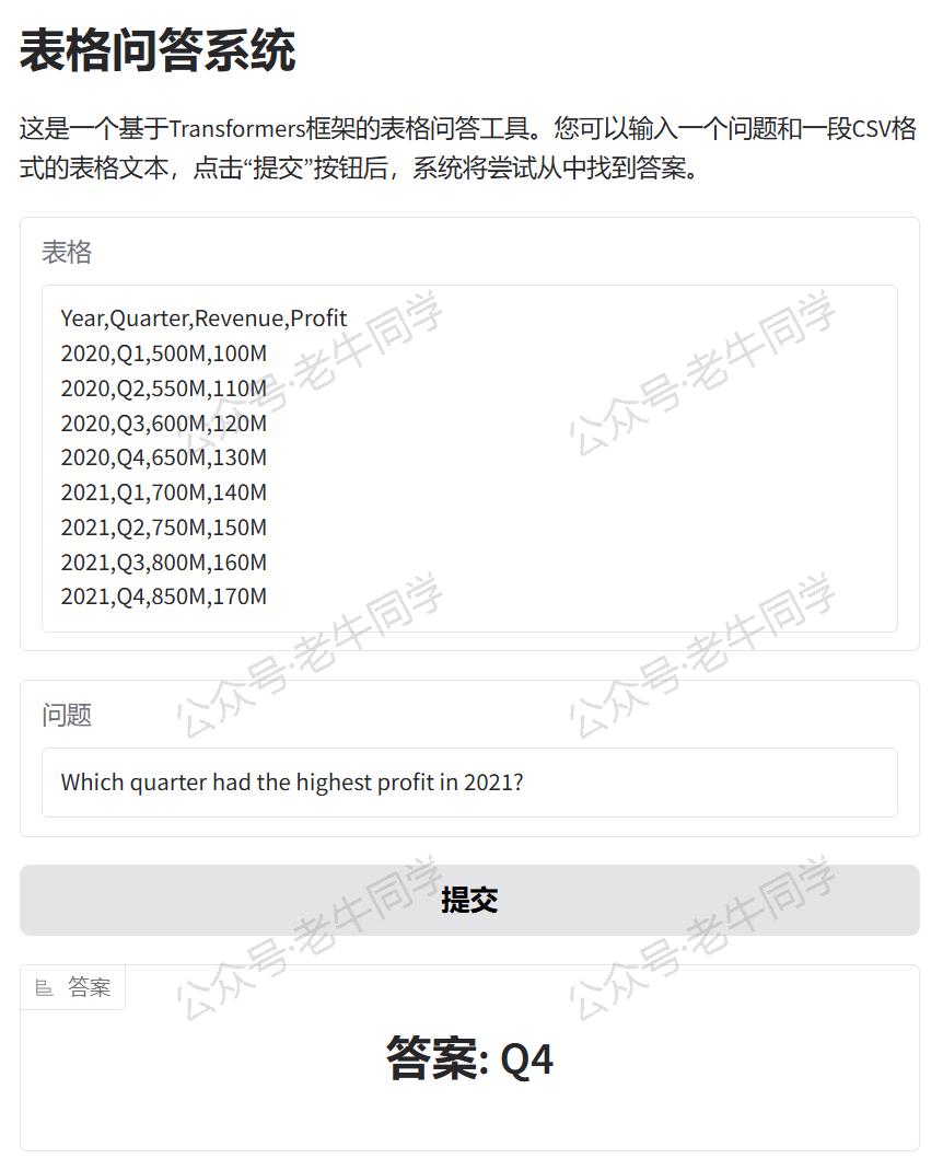 "这是一个基于Transformers框架的表格问答工具。您可以输入一个问题和一段CSV格式的表格文本,点击“提交”按钮后,系统将尝试从中找到答案。")