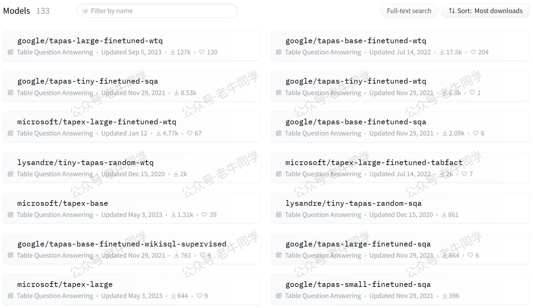 根据 Hugging Face 官网的数据,当前已有133个table-question-answering模型,这些模型已经在大量的表格数据上进行了微调,以更好地适应特定的任务需求。