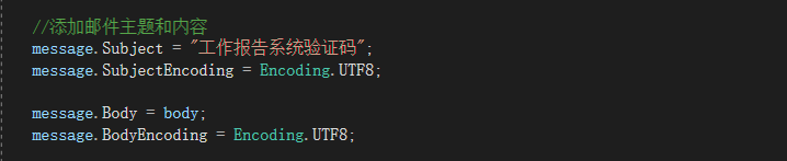 创建一个发送邮件的方法,首先创建一个SmtpClient对象、发件人地址对象、收件人地址对象和MailMessage对象,这里在创建SMTP对象的时候需要放入服务器地址作为参数、创建收发件人对象的时候需要输入邮箱地址、姓名和Encoding.UTF8作为参数,最后在创建MailMessage对象的时候需要把from和to作为参数传入,如图2-2所示;