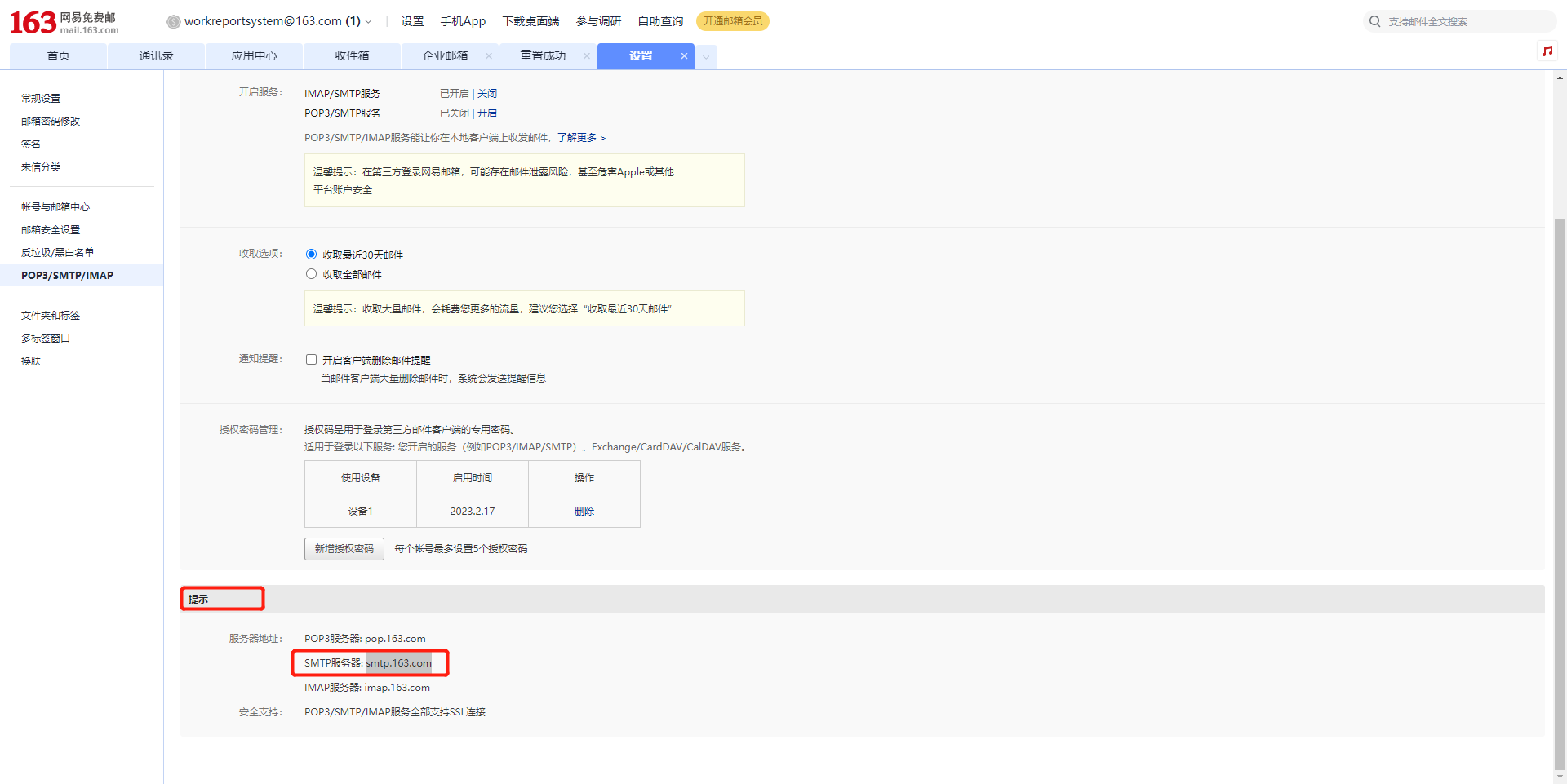这里我们可以看到提示中有服务器地址,我们开启的是SMTP服务,如图1-5所示,SMTP服务器的地址是:smtp.163.com;