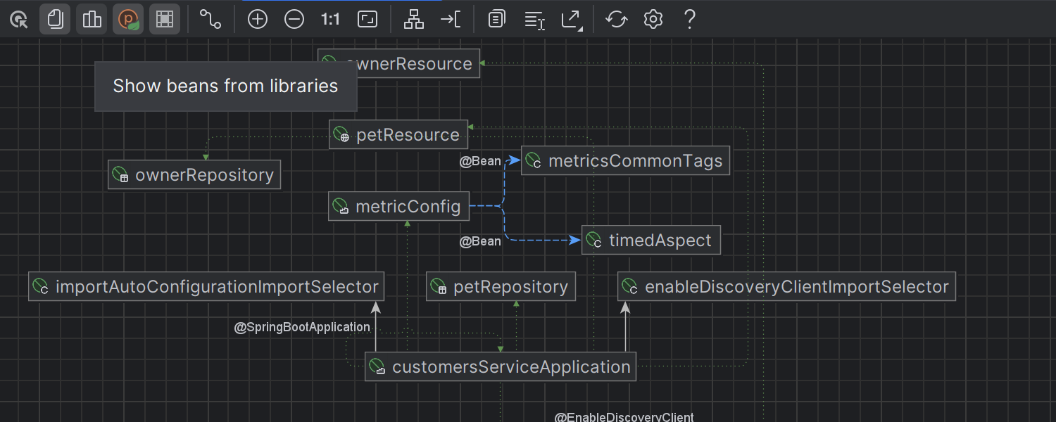 同时,该版本还引入了新的图标,增强了 Spring 模型图的可视化内容,如:Components、Controllers、Repositories。此外,您现在可以方便地切换库中 Bean 的可见性(默认情况下是隐藏的)。