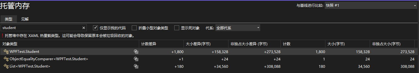 并且可以通过堆视图左上角类型筛选器快速查找指定类型的内存信息。下图中显示内存中增加了1800个Student对象实例,占用大约158KB内存。