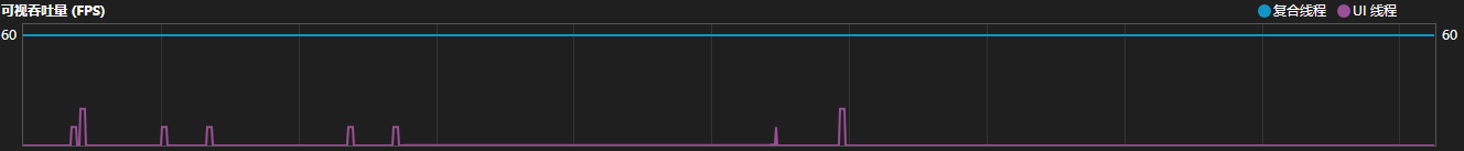“可视吞吐量(FPS)” 折线图显示了应用程序的 UI线程和复合线程上的每秒帧数 (FPS),较低的帧速率也意味着应用程序响应能力较差。