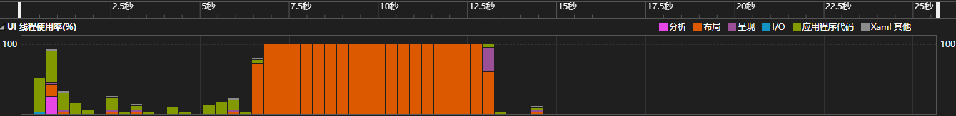 UI线程使用率以柱状图的形式呈现每个时间点UI线程使用情况,并用不同色块区分ui元素解析、布局、呈现、I/O、应用程序代码、Xaml其他使用UI线程的占比。UI线程使用率过高的时间点可能表示应用程序响应能力较差,是性能优化需要关注的地方。