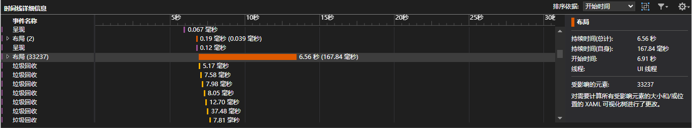 上边示例中,UI线程使用率过高,耗时最长的是布局,开始于6.91秒,总耗时6.56秒,涉及33237个元素,其原因就是TreeView没有开启虚拟化,一次性把所有的数据都渲染出来,导致UI响应差。通过这个分析找到性能瓶颈,就可以有的放矢进行优化。这里只需开启虚拟化即可,现实开发中导致性能瓶颈的原因多种多样,需结合实际情况优化解决。