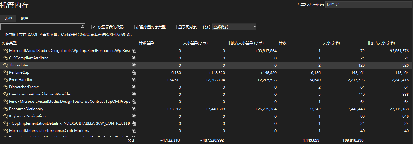 要查看内存使用情况时,可以在诊断工具窗口的内存使用情况选项卡点击“截取快照”按钮。通常我们会在内存显著增加前后各截取一次内存快照,然后对比两次快照中对象和堆大小的差异。