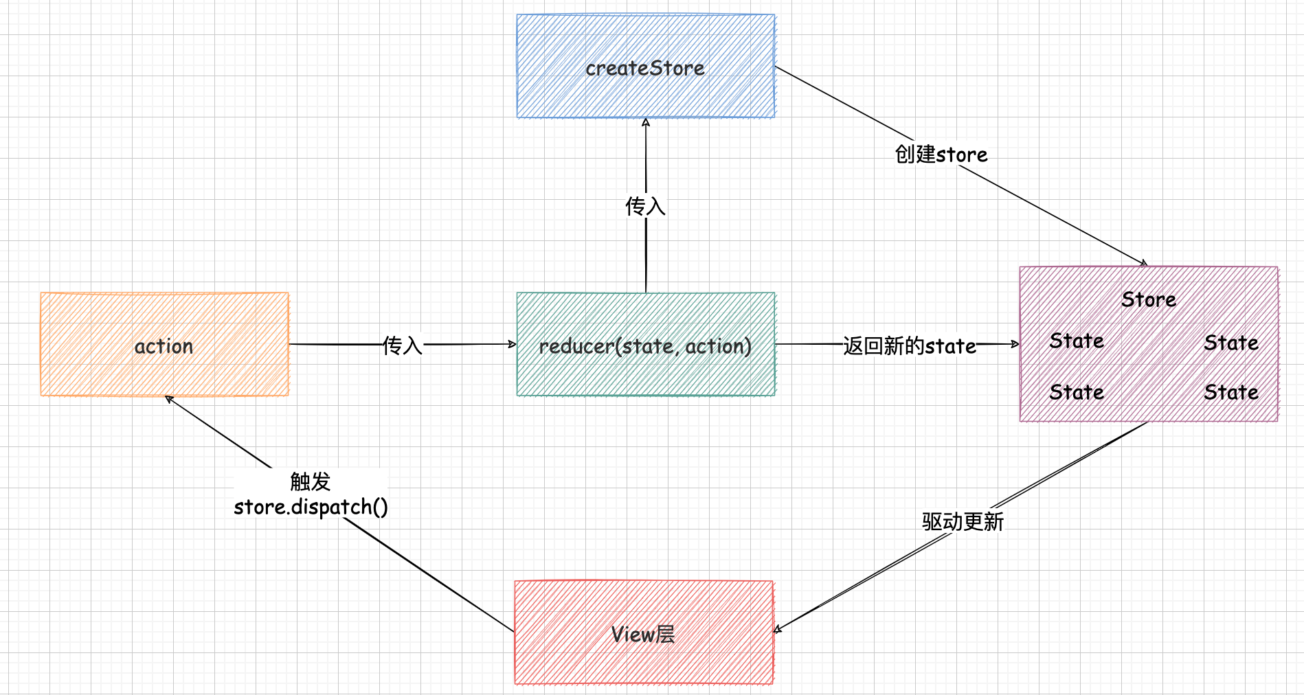 - 用纯函数执行修改:reducer 根据旧状态和传进来的 action 来生成一个新的 state (类似于 reduce 的思想,接受上一个 state 和当前项 action ,计算出来一个新值)