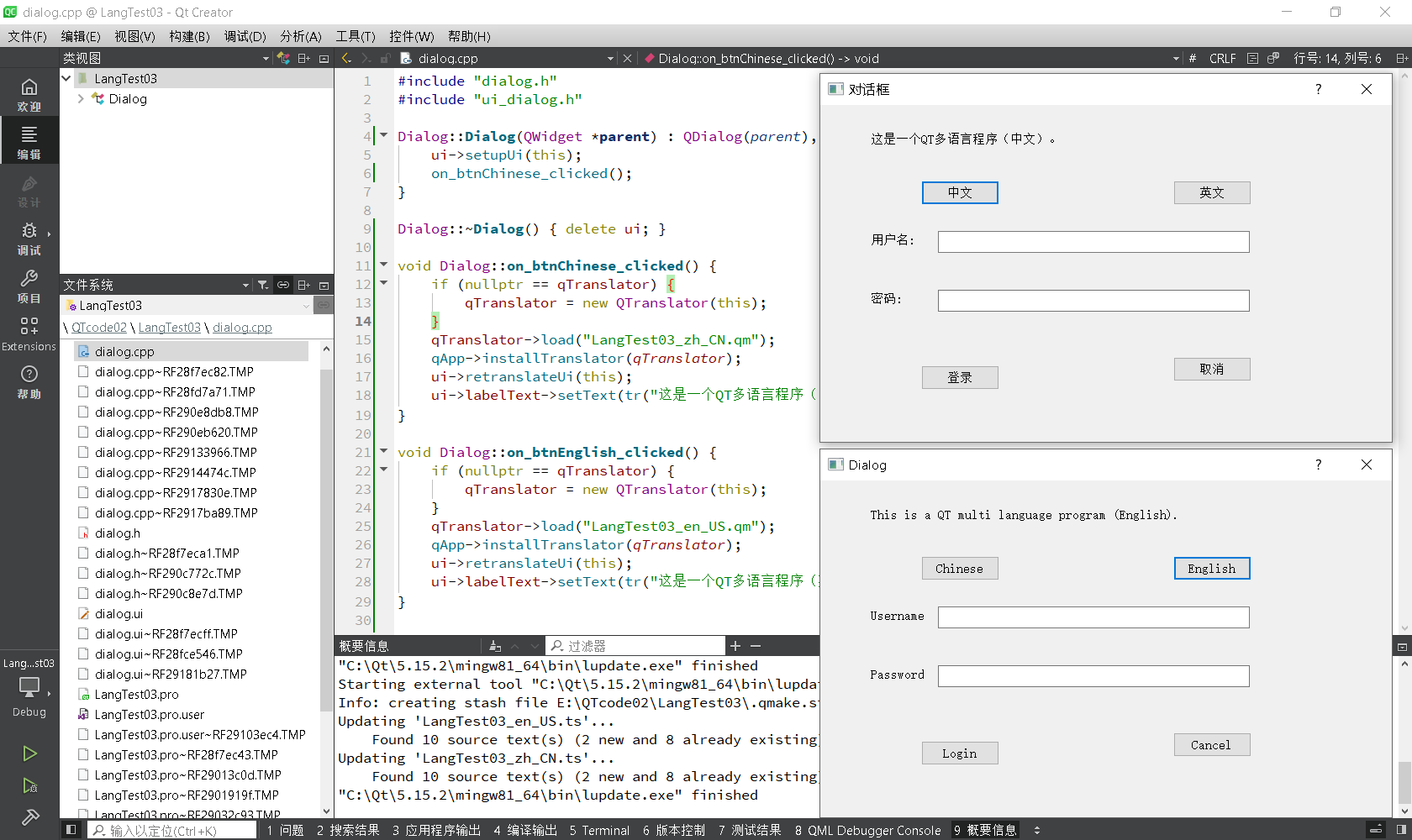 (3)在 e:\QTcode02\LangTest03\dialog.cpp 中实现“中文”、“英文”两个按钮的响应函数,添加语言切换和翻译刷新代码
