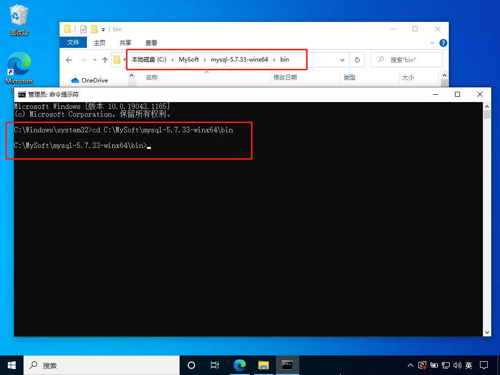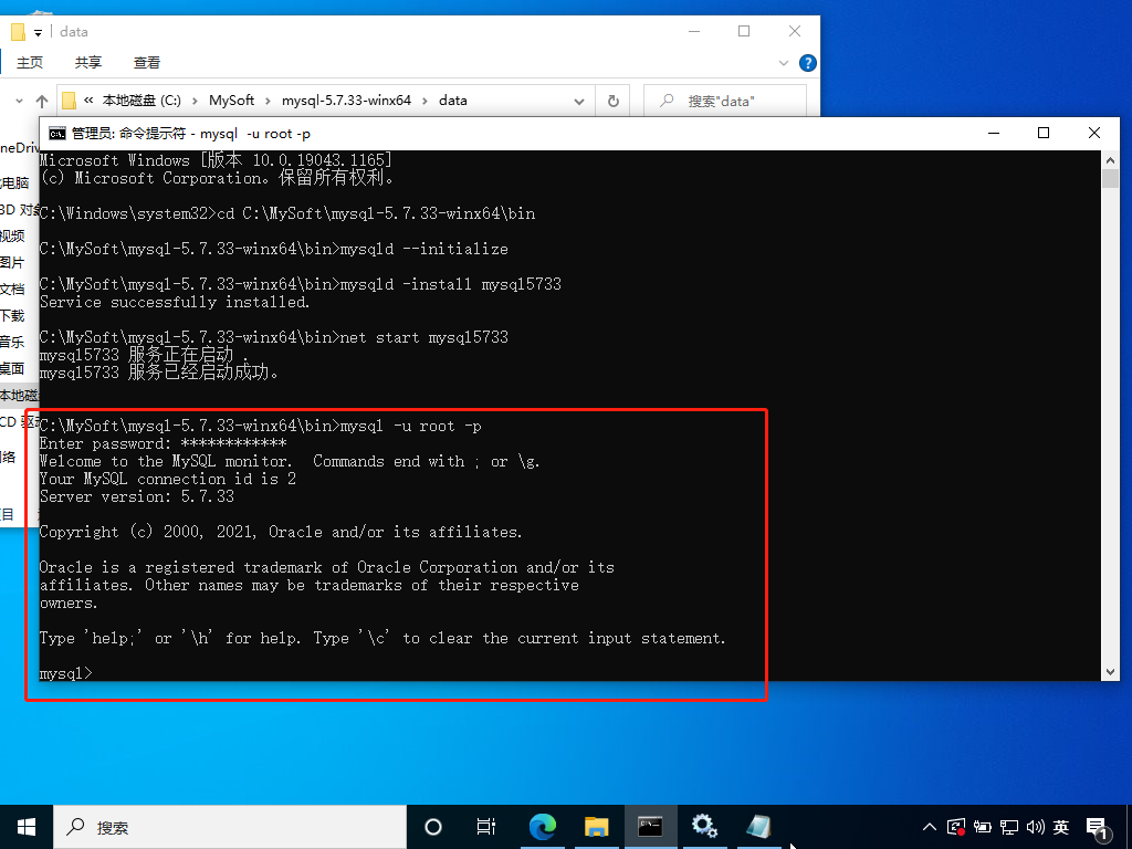 如上图所示,在“命令提示符”窗口中,进入 MySQL 的 bin 目录(本例为:C:\MySoft\mysql-5.7.33-winx64\bin)